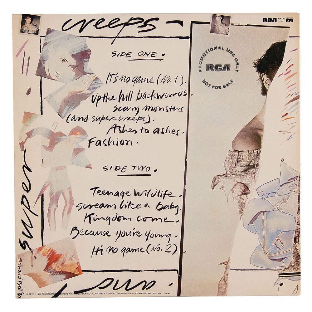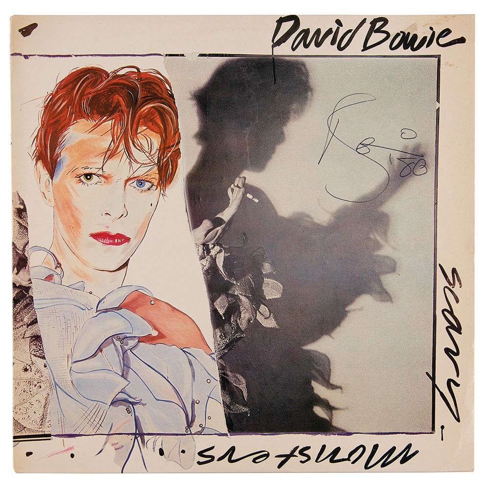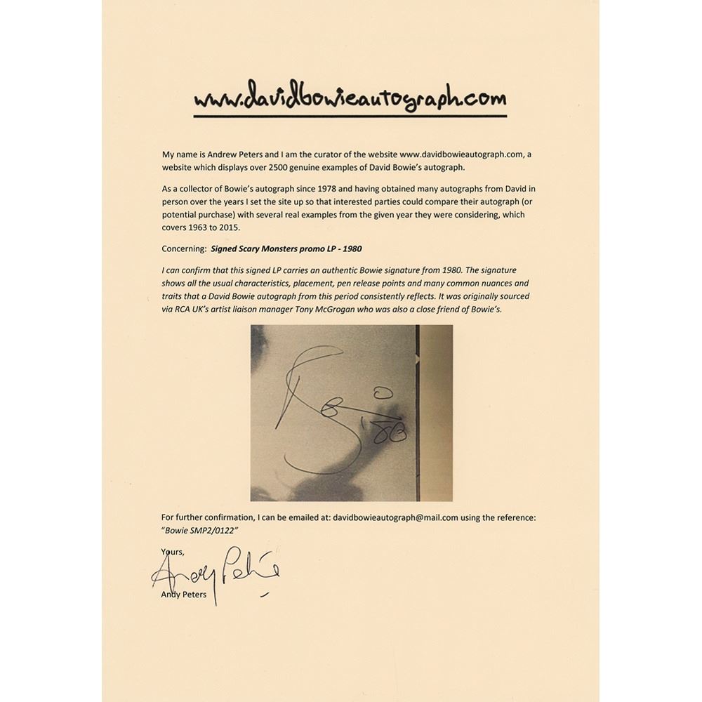 Scary Monsters promotional album by David Bowie, who has signed the front cover in black ballpoint, "Bowie, '80." In fine condition, with some creasing to borders and adhesive residue to the upper right. The record is not included. Accompanied by a letter of authenticity from Bowie expert Andy Peters, which notes that the album derives from the collection of Tony McGrogan, a former RCA employee and friend of David Bowie.