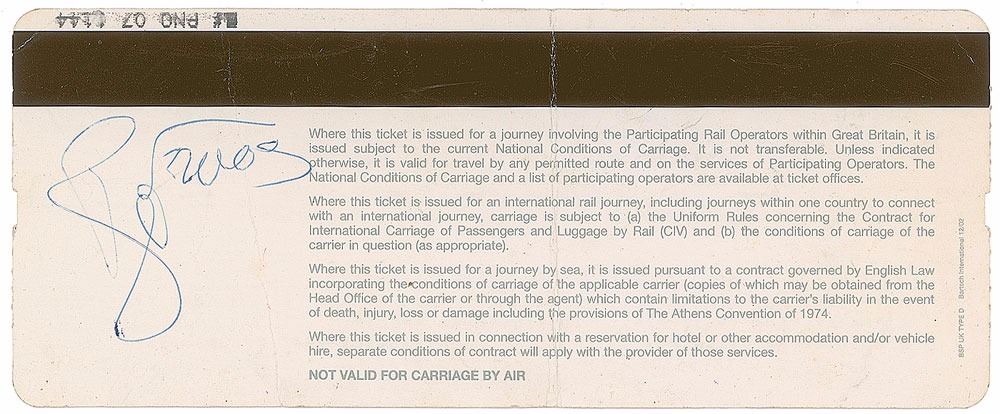 Ballpoint signature, "Bowie,” on the reverse of an off-white 8 x 3.25 railway ticket for a journey from Paris-Gare-du-Nord to Ashford International. In fine condition, with a central vertical fold, and a crease passing through the signature.