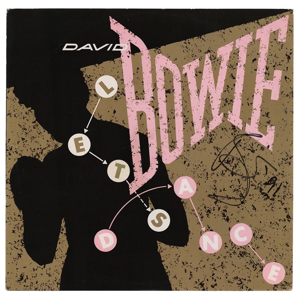 'Let's Dance / Cat People' 12-inch single album by David Bowie, who has signed the front cover in black felt tip, "Bowie, '91." In fine condition. The record is included. Accompanied by a letter of authenticity from David Bowie autograph expert Andrew Peters.