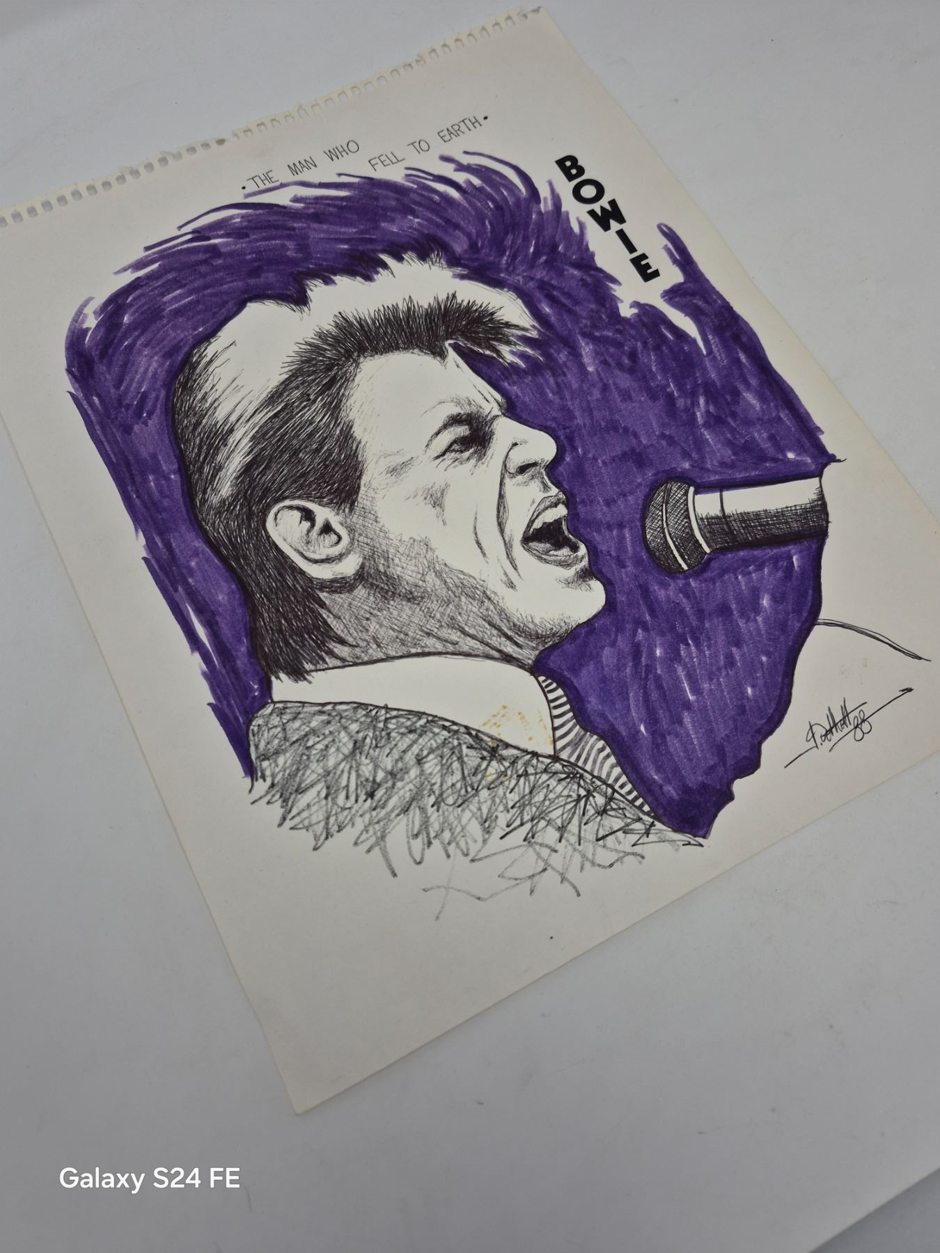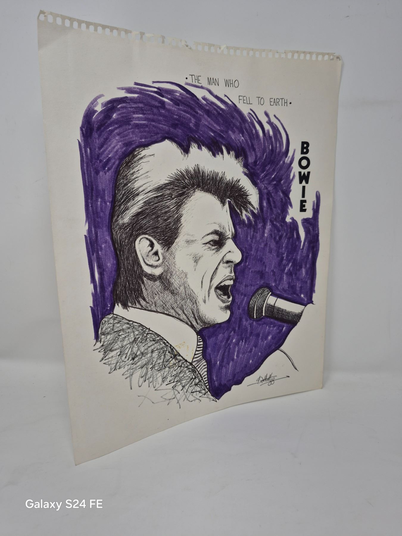 Striking pen and ink fan artwork of David Bowie, inspired by his role in “The Man Who Fell to Earth.” Signed by artist.