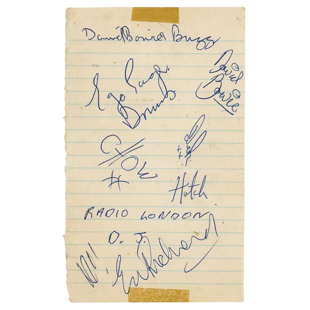 Desirable vintage circa 1966 ballpoint signatures of Bowie and his band The Buzz, "David Bowie," "'Ego' Eager, Drums," "Hutch [John Hutchinson]," "Chow [Derek Boyes]," and "Dek [Derek Fearnley],” on an off-white 3.75 x 6.5 lined sheet, also signed by Radio London DJ Earl Richmond. In fine condition, with old tape stains to the top and bottom edges. Accompanied by a letter of provenance stating that they were acquired at the Marquee Club in London on April 10, 1966. Richmond was a friend and supporter of the group, and suggested the name of 'The Buzz' to Bowie.