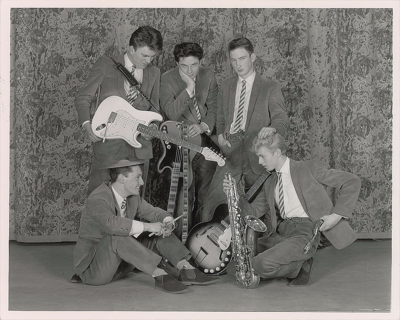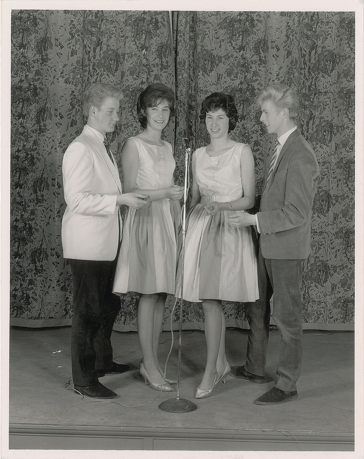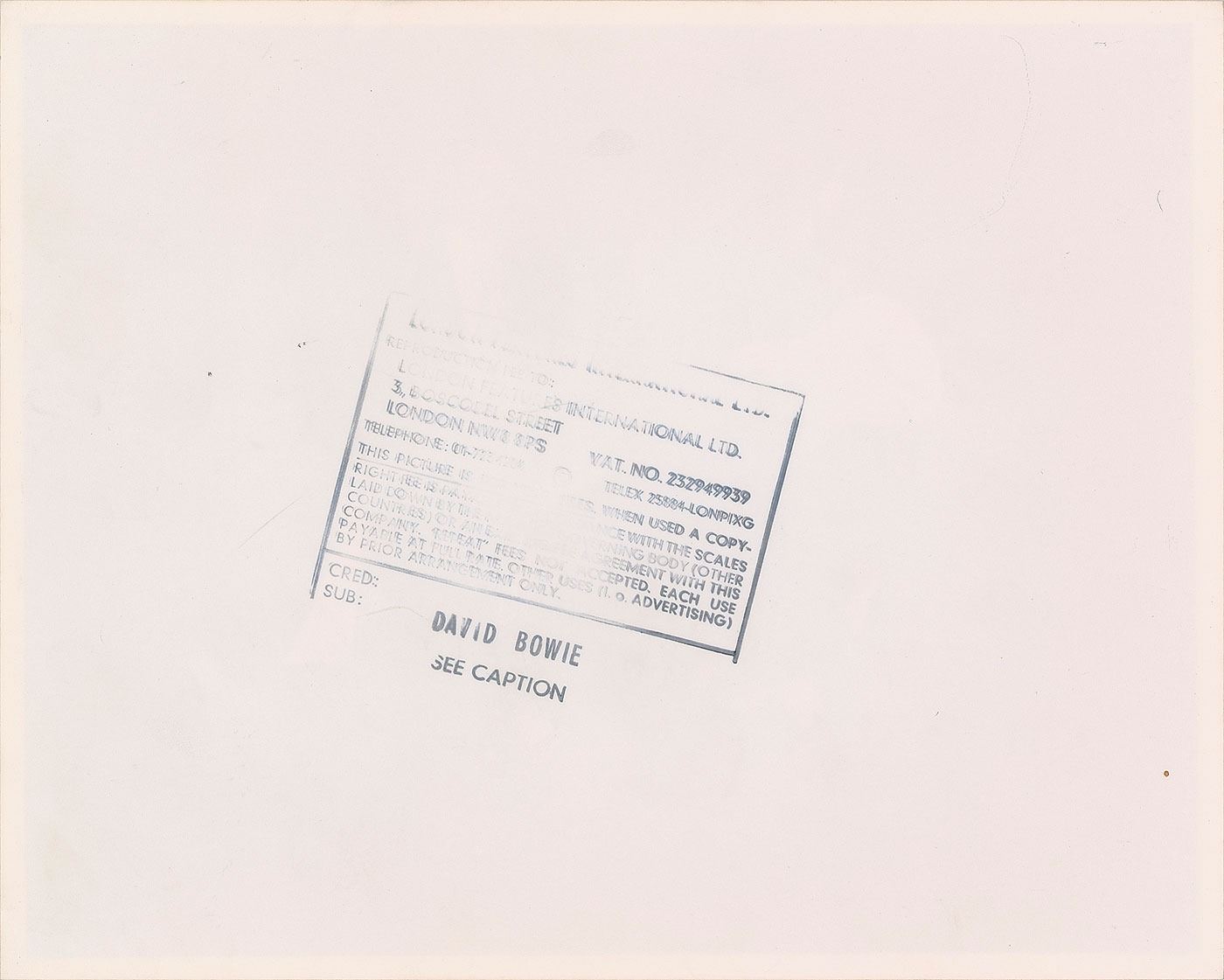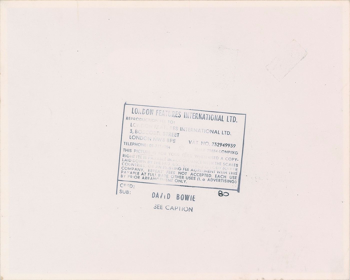 Two very rare crystal-clear original glossy photos of David Bowie with his first band, The Konrads, taken in the 1960s and probably printed from the original negatives circa 1970s: one 10 x 8 photo of the band with their instruments, showing Bowie with his tenor saxophone; and one 8 x 10 photo of Bowie with singers at a microphone. Both bear London Features International credit stamps on the reverse. In overall fine condition, with small gouges to the lower left of the second photo.
