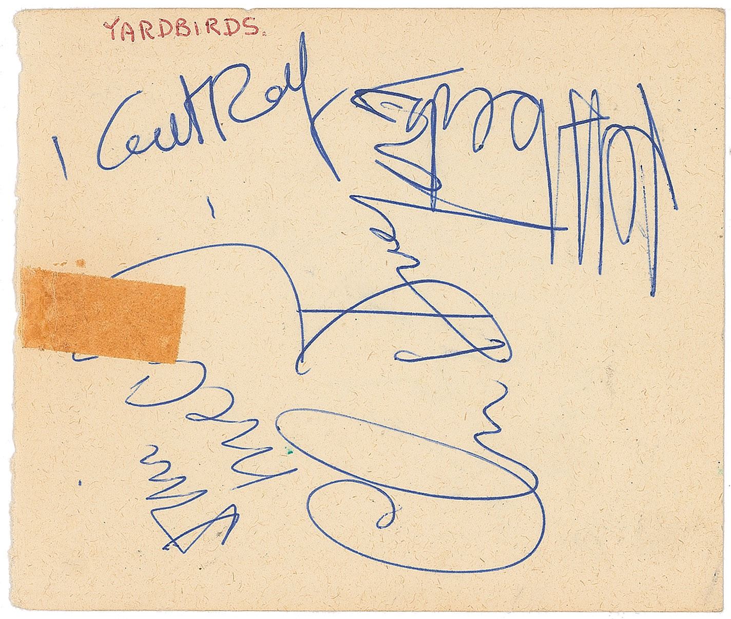 Highly appealing vintage off-white 4.5 x 3.75 album page signed on one side in green ballpoint, "Best wishes, David Bowie," and on the opposite side in blue ballpoint by The Yardbirds, "Chris Dreja," "Jim McCarty," "Keith Relf," and "Jeff Beck." In fine condition, with an old tape stain touching McCarty's last name, lightly showing through to the Bowie side. Accompanied by a certificate of authenticity from Tracks.