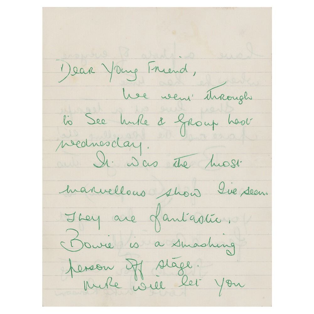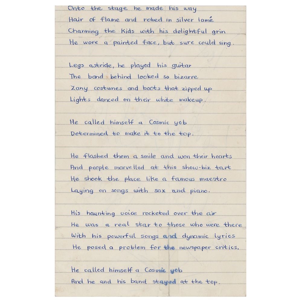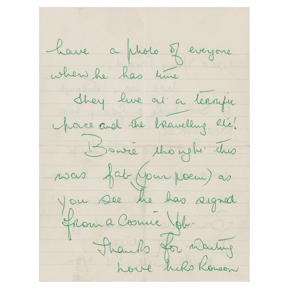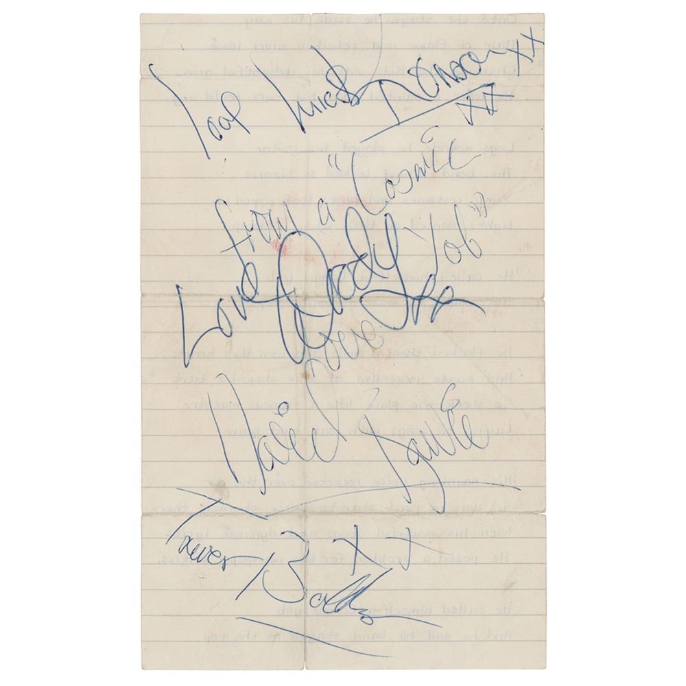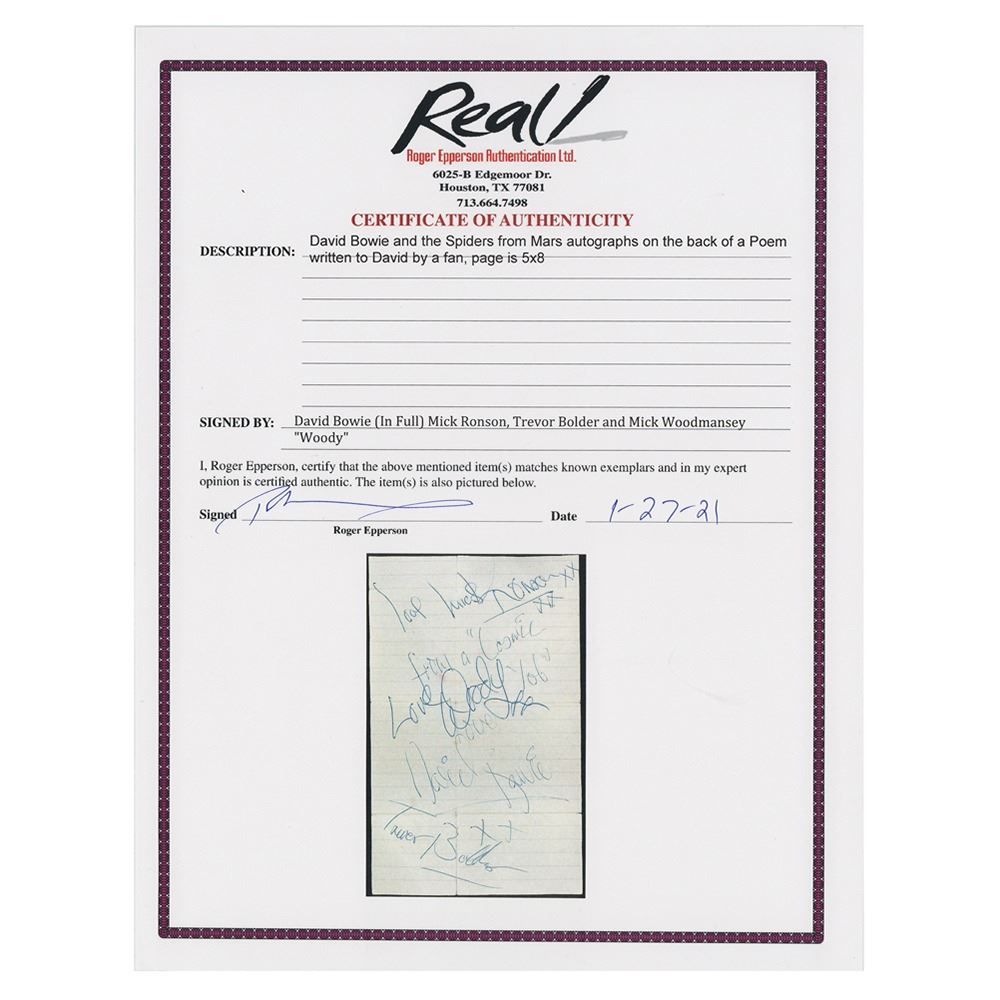 Vintage ballpoint signatures of Davie Bowie and the Spiders from Mars‰ÛÓ "From a 'Cosmic Yob,' Love, David Bowie,‰Û ‰ÛÏLove, Mick Ronson, xxxx,‰Û ‰ÛÏLove, Woody, xx,‰Û and ‰ÛÏTrevor Bolder‰Û‰ÛÓon an off-white 5 x 8 notebook page, the reverse of which bears a handwritten fan poem about Bowie, which refers to him as ‰ÛÏa Cosmic Yob.‰Û The fan sent the poem to Minnie Ronson, the mother of guitarist Mick Ronson, who forwarded the poem for the band to read and sign; Minnie then mailed the poem back to the fan with a handwritten letter, in part: ‰ÛÏBowie thought this was fab (your poem) as you see he has signed from a Cosmic Yob.‰Û Minnie‰Ûªs letter and her mailing envelope are included with the lot. In very good to fine condition, with light creasing and intersecting folds. Accompanied by certificates of authenticity from Tracks, REAL, and Rockaway Records.
