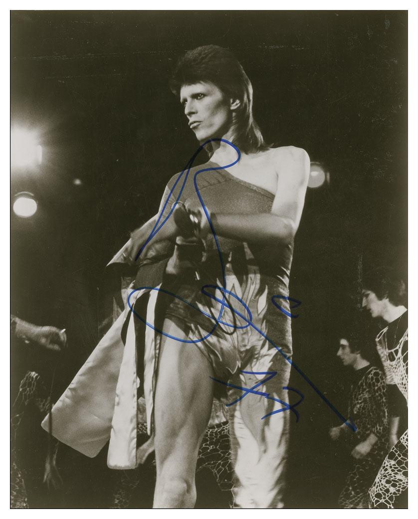 Glossy 7.5 x 9.5 photo of Bowie on stage as Ziggy Stardust, signed in-person in blue felt tip and dated 1977. In very good condition, with trimmed edges, and scattered creases and surface marks.