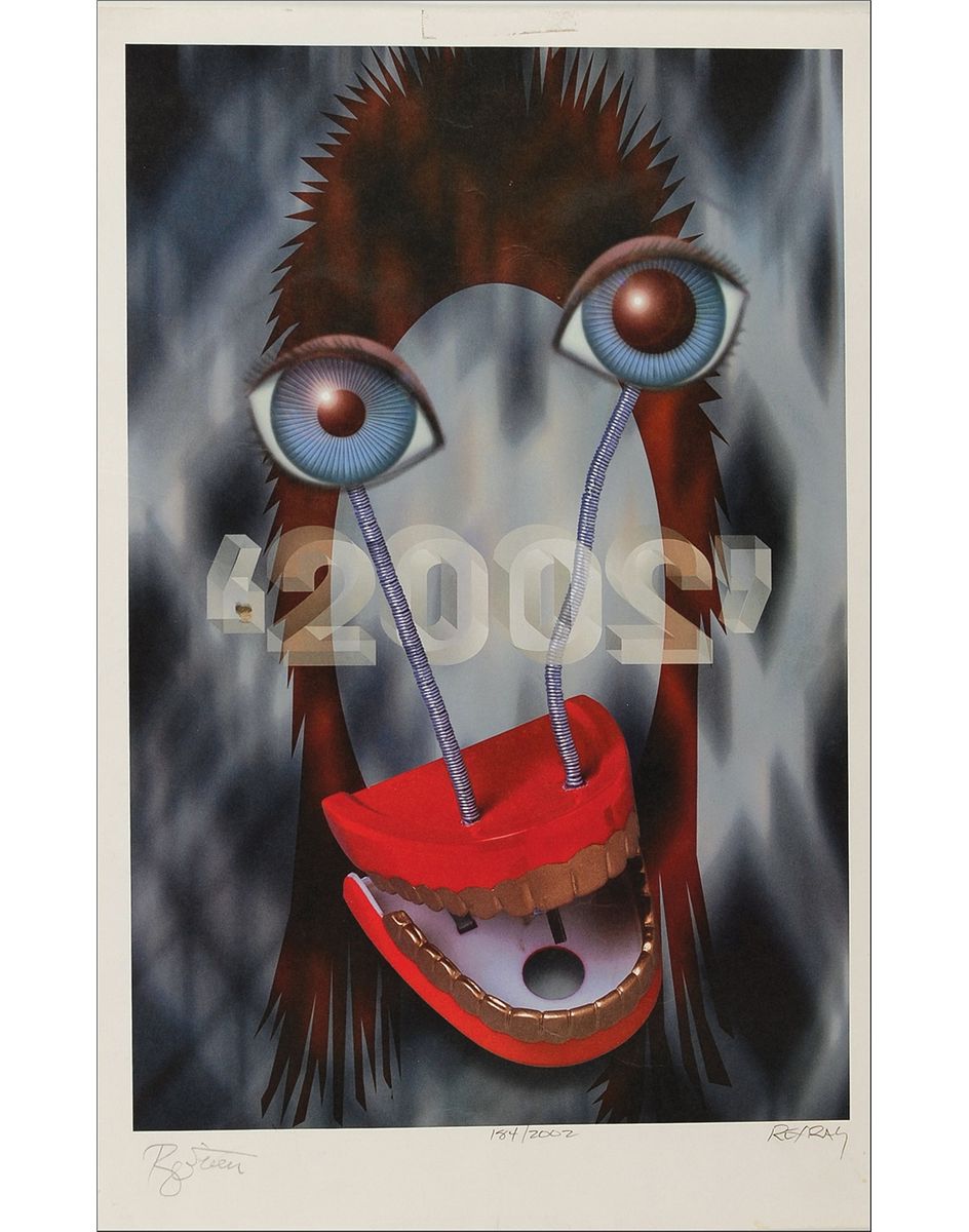 Color limited edition 11 x 17 lithograph entitled ‘2002,’ numbered #184/2002, signed in pencil. Also signed in pencil by the artist Rex Ray. In very good condition, with scattered creases and tape remnants to top and bottom edge. Accompanied by a certificate of authenticity from James Spence.