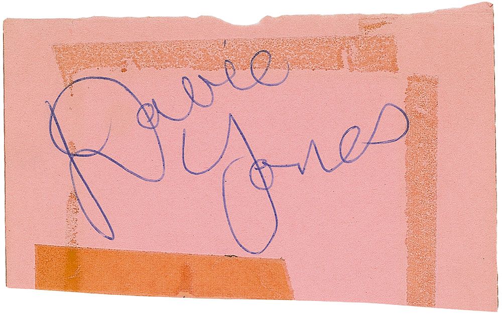 Early vintage ballpoint signature, “Davie Jones,” on a pink 3.75 x 2 slip. In very good condition, with a rough top edge, old tape along bottom edge, and some toning from tape on reverse.