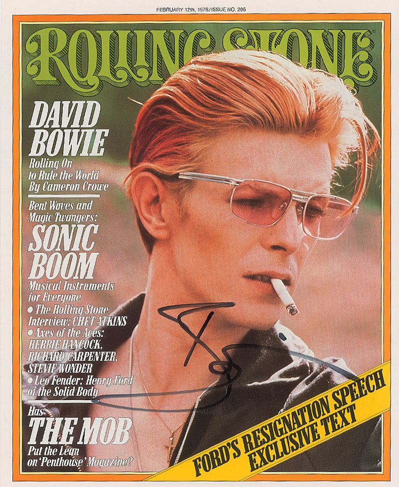 Color 10.75 x 13.25 book photo of the cover of Rolling Stone, dated February 12, 1976, issue #206, featuring Bowie, signed in black felt tip. In fine condition.