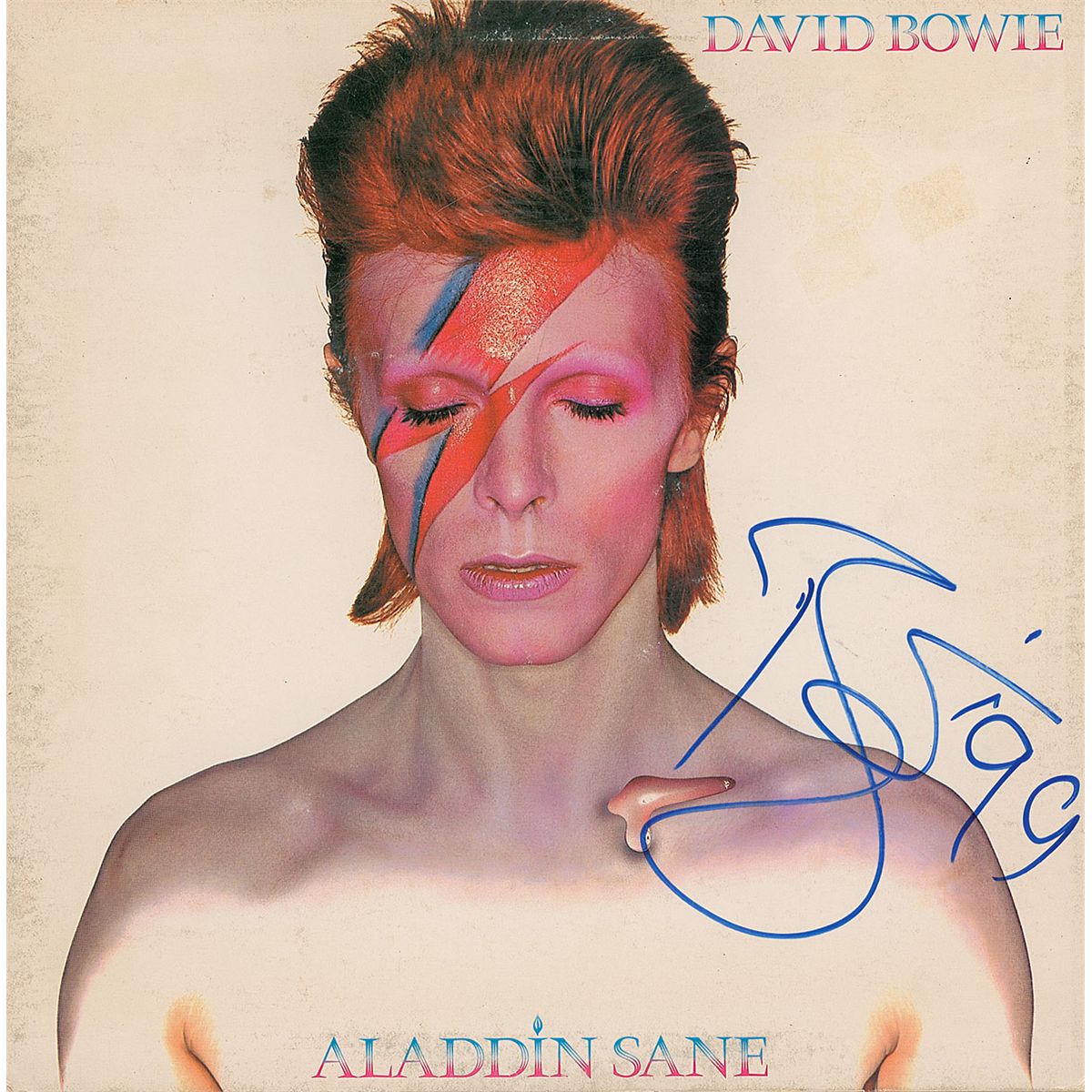Aladdin Sane album signed on the front cover in blue felt tip, “David Bowie ´99.” Partial edge separation and scattered light cover wear, otherwise fine condition. The record is not included. Accompanied by a full letter of authenticity from Roger Epperson/REAL.