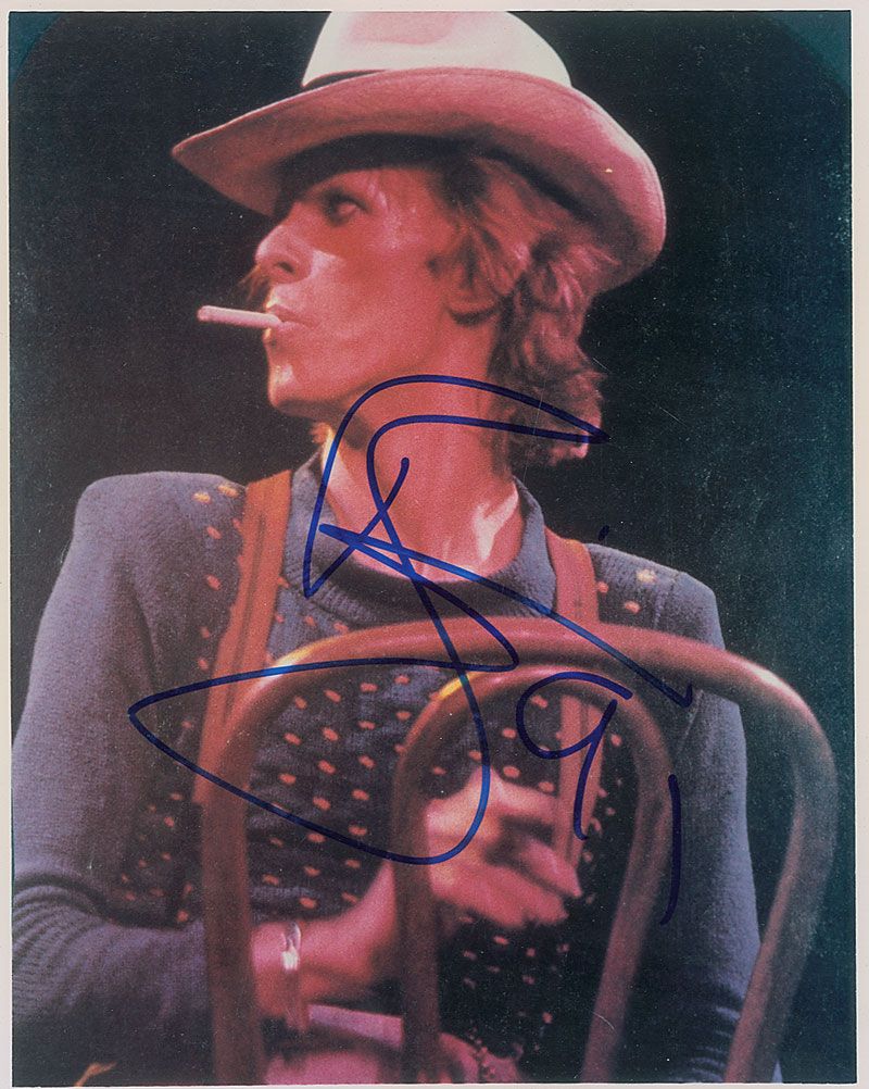 Color glossy 8 x 10 photo of Bowie on stage, signed in blue felt tip and dated 1991. In fine condition.
