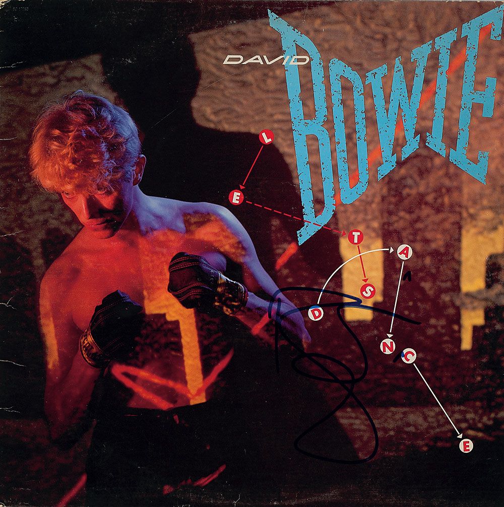 Let’s Dance album signed in person on the front cover in blue felt tip. In fine condition. The record is not included. Originally obtained by in-person specialist Mike Wehrmann.