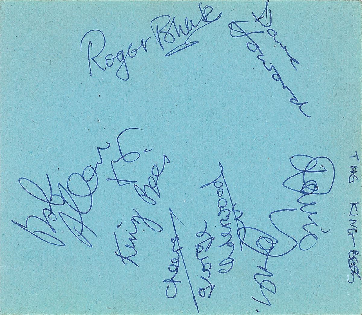 Circa 1964 vintage ballpoint signatures, “Davie Jones [Bowie],” “Roger Bluck,” “Dave Howard,” “Bob Allen, XX, King Bees,” and “Cheers, George Underwood,” on a blue 4.5 x 3.75 album page. Reverse bears ballpoint signatures from The Animals. In fine condition. An incredibly early signature dating to Bowie’s brief time with the King Bees.