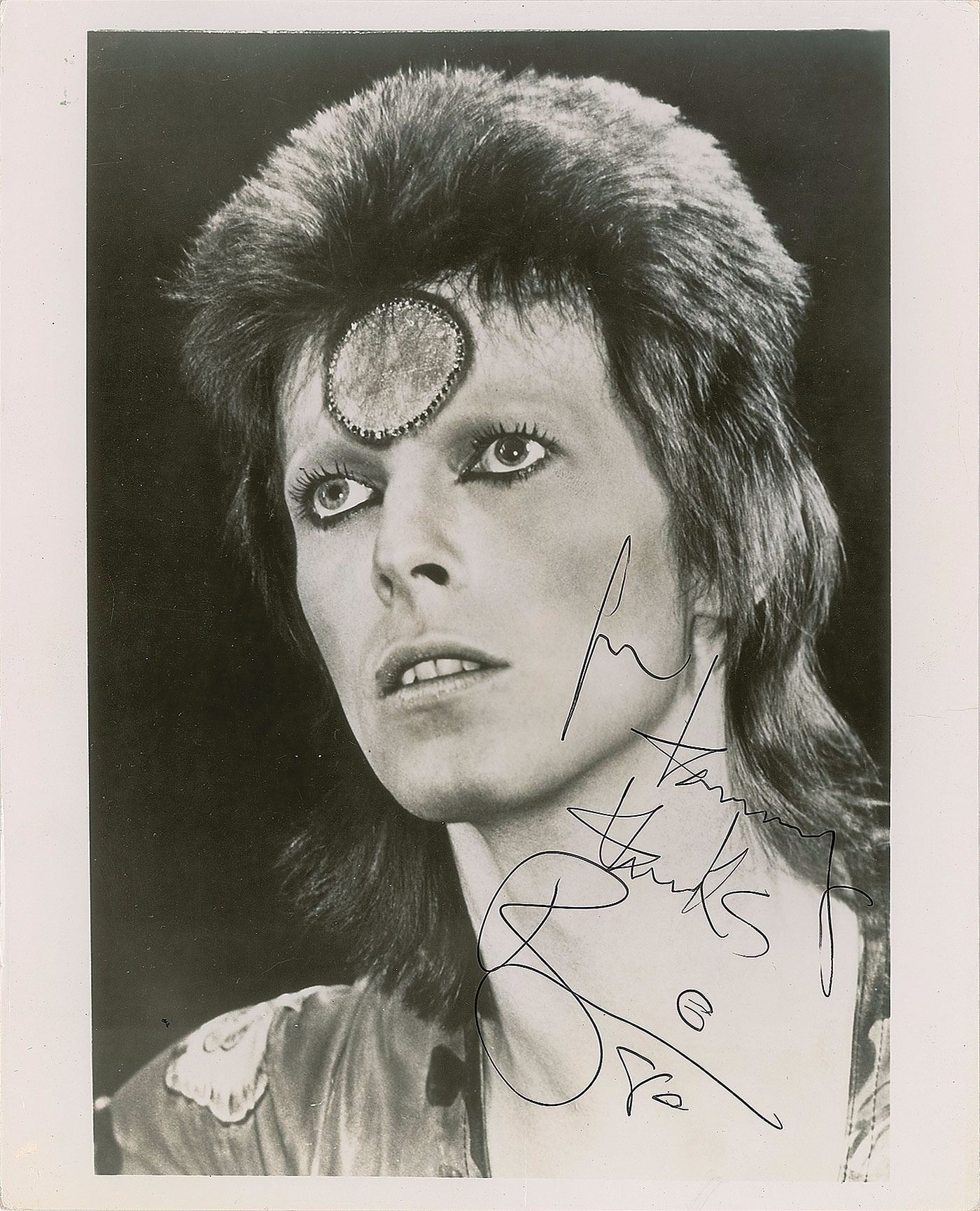Glossy 8 x 10 close-up photo of David Bowie as Ziggy Stardust, signed and inscribed in black ink, "For Tommy, thanks, Bowie, 80.” In fine condition, with lights creases and surface impressions.