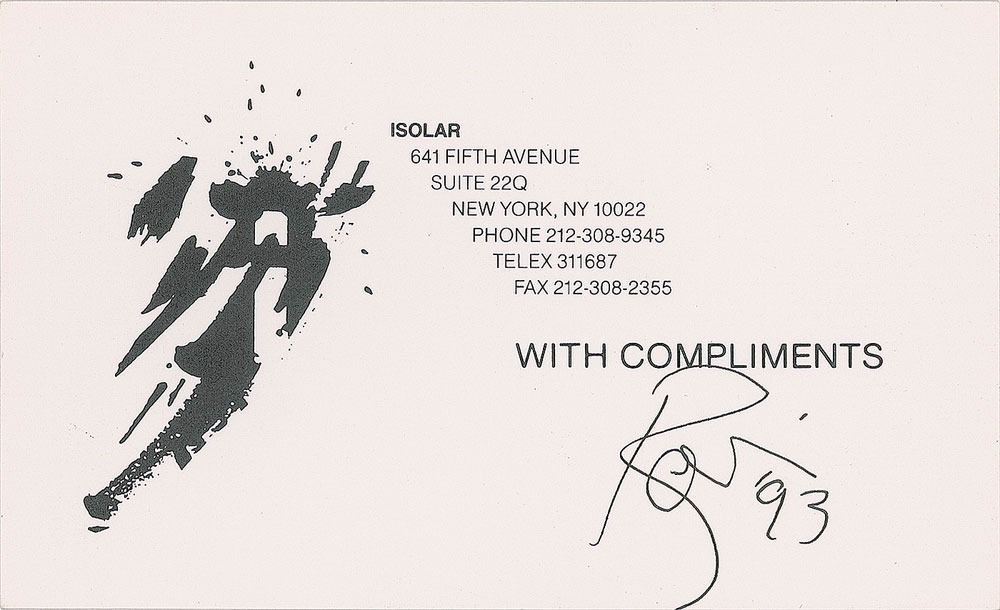 Ballpoint signature of David Bowie, who adds the year, "93," on a white 5.25 x 3.25 Isolar compliments card. In fine condition. Accompanied by full letters of authenticity from Tracks and PSA/DNA. Bowie signed a number of these cards for a BMG Music senior executive in 1993, and they were sent out with copies of his Black Tie White Noise album. This example comes from a portion of the cards that were retained by the executive. Isolar was Bowie’s production company.