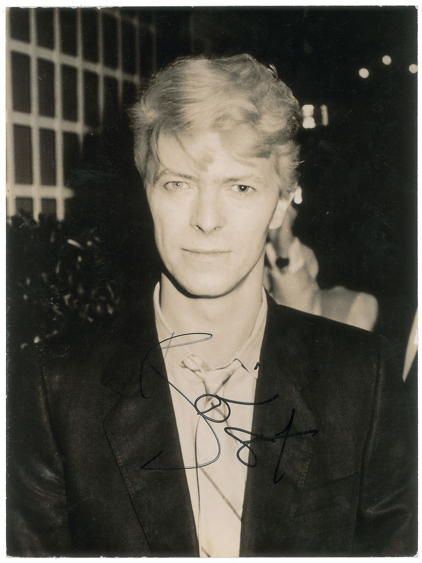 Semi-glossy 7.5 x 10 silver gelatin photo of the multitalented English pop star in an attractive bust-length pose, signed in black felt tip, "Bowie, 87." Reverse bears an affixed caption and Ron Galella photography stamps. In fine condition.