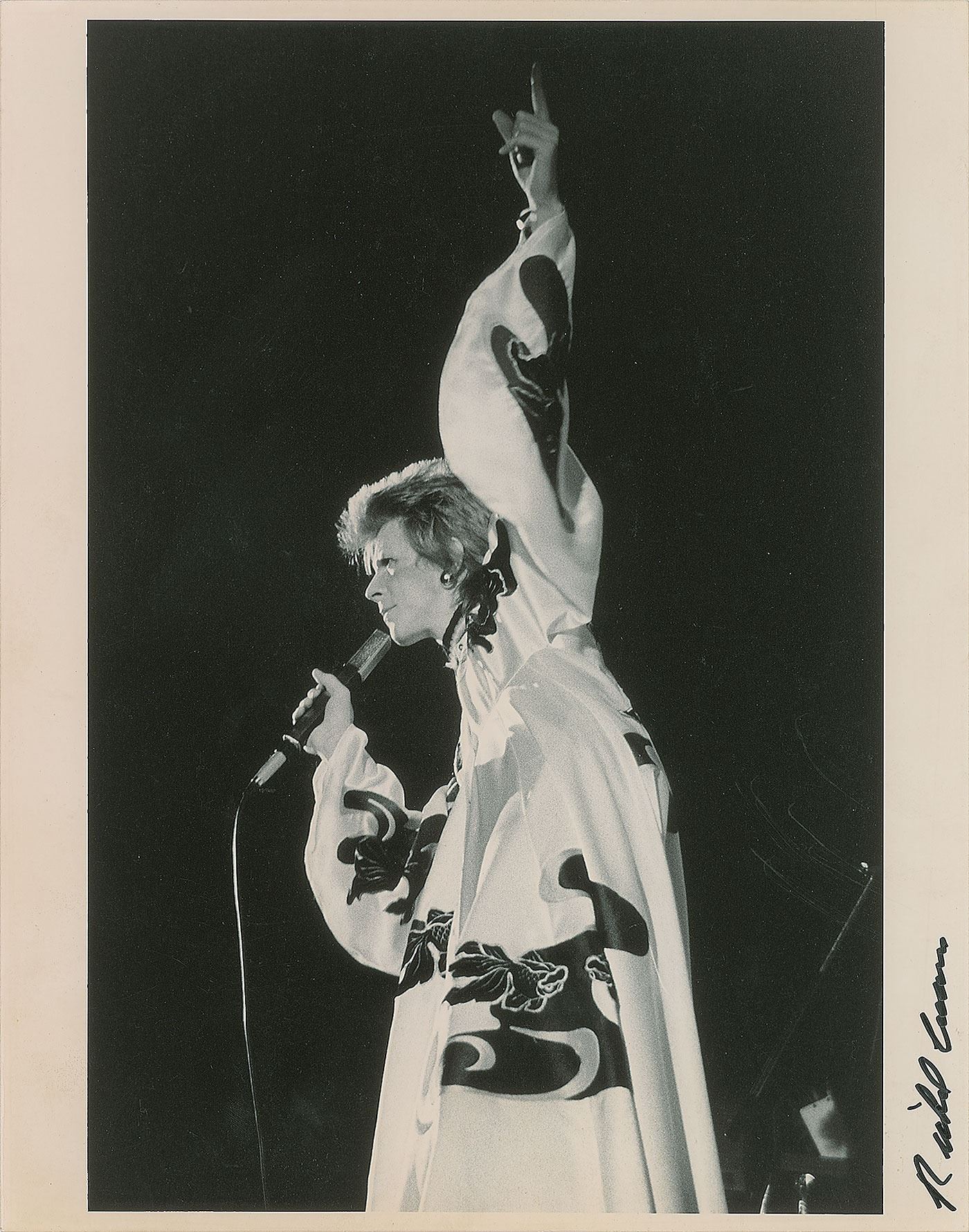 Original satin-finish 11 x 14 photo of Bowie mid-performance by Richard Creamer, signed vertically in the right border in black felt tip by Creamer. In fine condition. Provenance: Richard Creamer Estate.