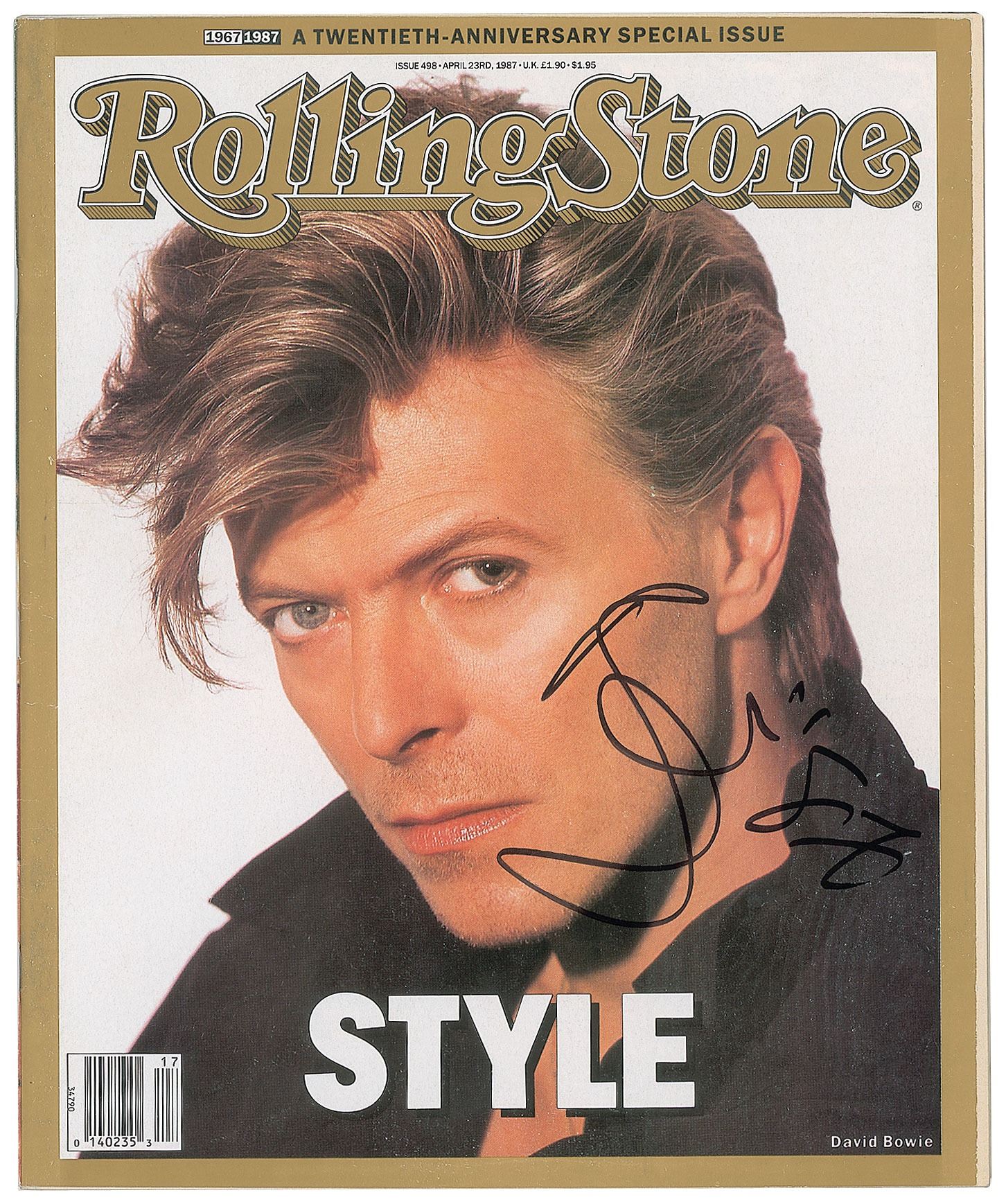 20th anniversary special issue of Rolling Stone magazine from April 23, 1987, No. 498, with front cover featuring a handsome image of David Bowie above bold text, "Style," 176 pages, 10 x 12, signed on the front cover in black felt tip, "Bowie, 87." In fine condition. Accompanied by a letter of authenticity from Bowie expert Andy Peters.