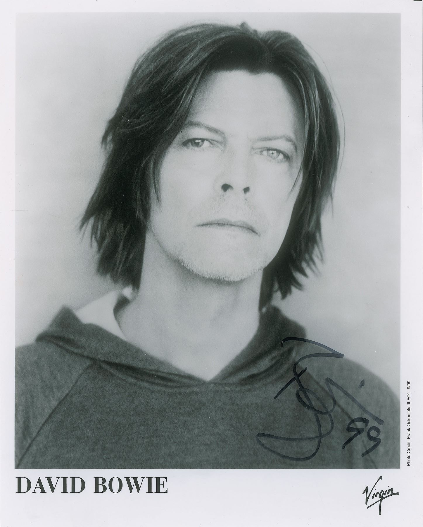 Attractive satin-finish 8 x 10 Virgin Records promotional photo of David Bowie for his Hours album, signed in black felt tip, "Bowie, '99." In fine condition, with one small crease near the right border. Accompanied by Virgin press release material for Hours, as well as a letter of authenticity from David Bowie autograph expert Andrew Peters.