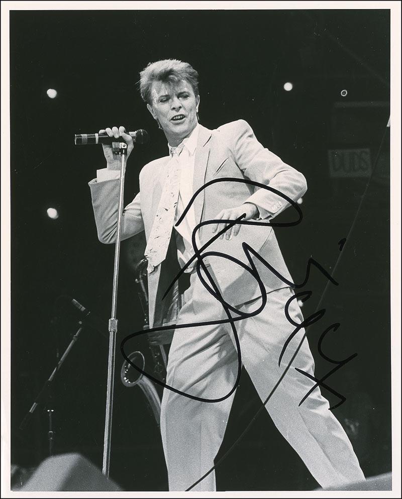 Glossy 8 x 10 photo of Bowie on stage, signed in-person in black felt tip. In fine condition, with bends to lower corners. Signature was obtained at the airport in Stockholm, Sweden, July 27, 1997 after his concert at the Lollipop Festival.