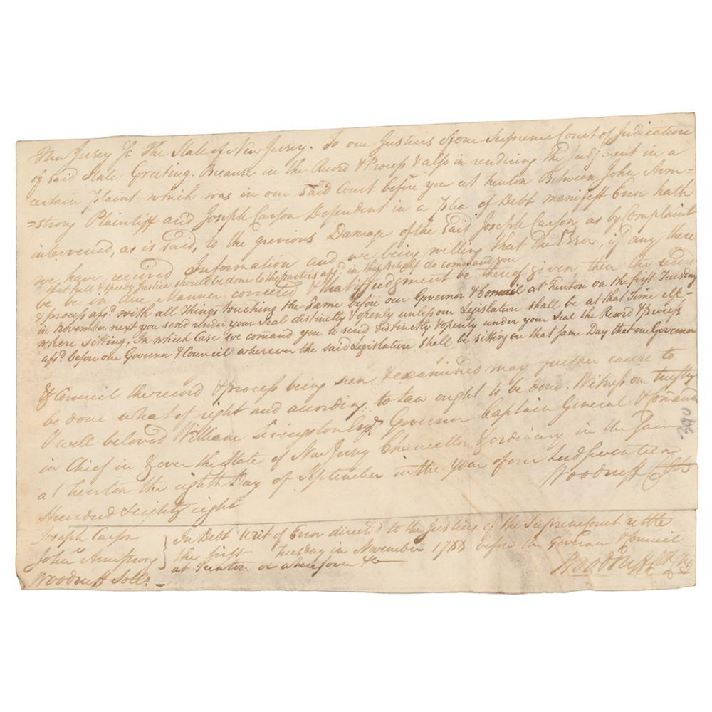 Endorsement, signed "David Brearley," penned on the reverse of a 9 x 6 legal manuscript document dated to September 8, 1768. In very good to fine condition, with a long slice expanding across the bottom of the document, not affecting the signature.