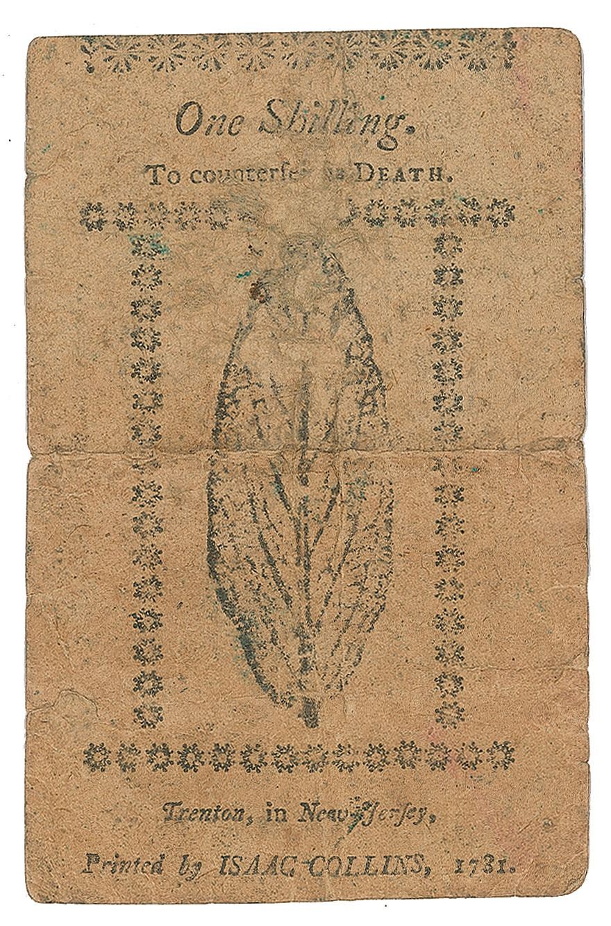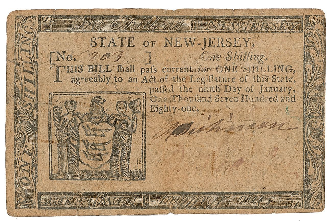 Revolutionary War-dated New Jersey engraved bank note for "One Shilling," 3.75 x 2.5, issued as No. 203, and reading: “This Bill shall pass current for One Shilling, agreeably to an Act of the Legislature of this State, passed the ninth Day of January, One Thousand Seven Hundred and Eighty-one.” Signed at the conclusion by David Brearley and Philemon Dickinson. Printed in Trenton, New Jersey, by Isaac Collins, with reverse bearing the cautionary message: "To Counterfeit is Death." In very good condition, with overall wear, a central vertical fold, and Brearley's signature very faint.