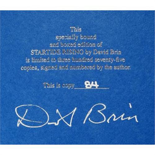 <B>David Brin: Signed Limited First Hardcover Edition of <I>Startide Rising</B></I></B></I> (West Bloomfield: Phantasia Press, 1985), first hardcover edition, number 84 of 375 specially bound copies, 392 pages, signed and numbered by the author in silver ink on a special limitation page bound in back, frontis and cover art by David Cherry, blue cloth with gilt titles, 8vo (6.25" x 9.25"), as new in a fine unclipped jacket. Housed in the original matching blue cloth slipcase. Winner of the 1983 Nebula and 1984 Hugo awards for best novel.<BR><BR><b>Shipping:</b> Books & Catalogs (<a target="_blank" href="http://www.heritageauctions.com/common/shipping.php">view shipping information</a>)