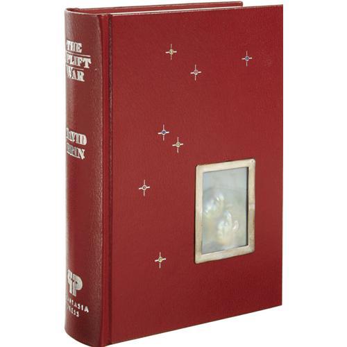 <B>David Brin: Signed Limited First Edition of<I> The Uplift War.</B></I></B></I> (West Bloomfield: Phantasia Press, 1987), first edition, copy "N" of 26 lettered copies which were not for sale to the public, 506 pages, signed by the author on a special limitation page bound in back, bound in full red leather with a hologram by Richard Ulrich inset on the front cover in what appears to be a sterling frame, 8vo (6.5" x 9.25"), fine in a fine cloth slipcase as issued. <I>From the Ventura Collection.</B></I><BR><BR><b>Shipping:</b> Books & Catalogs (<a target="_blank" href="http://www.heritageauctions.com/common/shipping.php">view shipping information</a>)