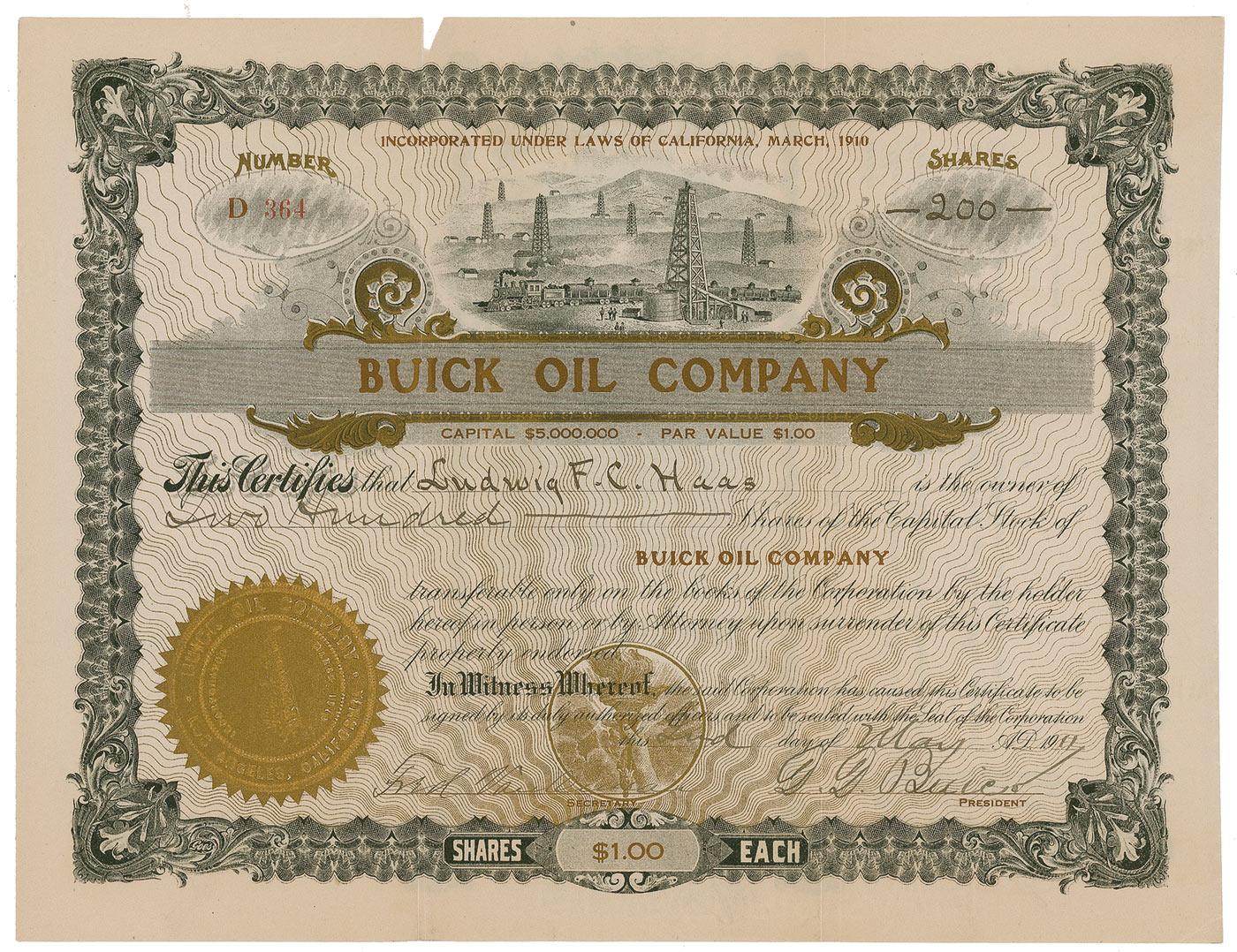 Automotive engineer and businessman (1854–1929) who founded the automobile manufacturing company whose name survives as a division of General Motors. Partly-printed DS, signed “D. D. Buick,” one page both sides, 10.5 x 8.25, Buick Oil Company letterhead, May 2, 1911. Scarce engraved and ornate stock certificate for 200 shares of Buick Oil Company to Ludwig F. C. Haas, nicely signed “D. D. Buick,” as president. In fine condition, with two vertical folds and a mild shade of toning