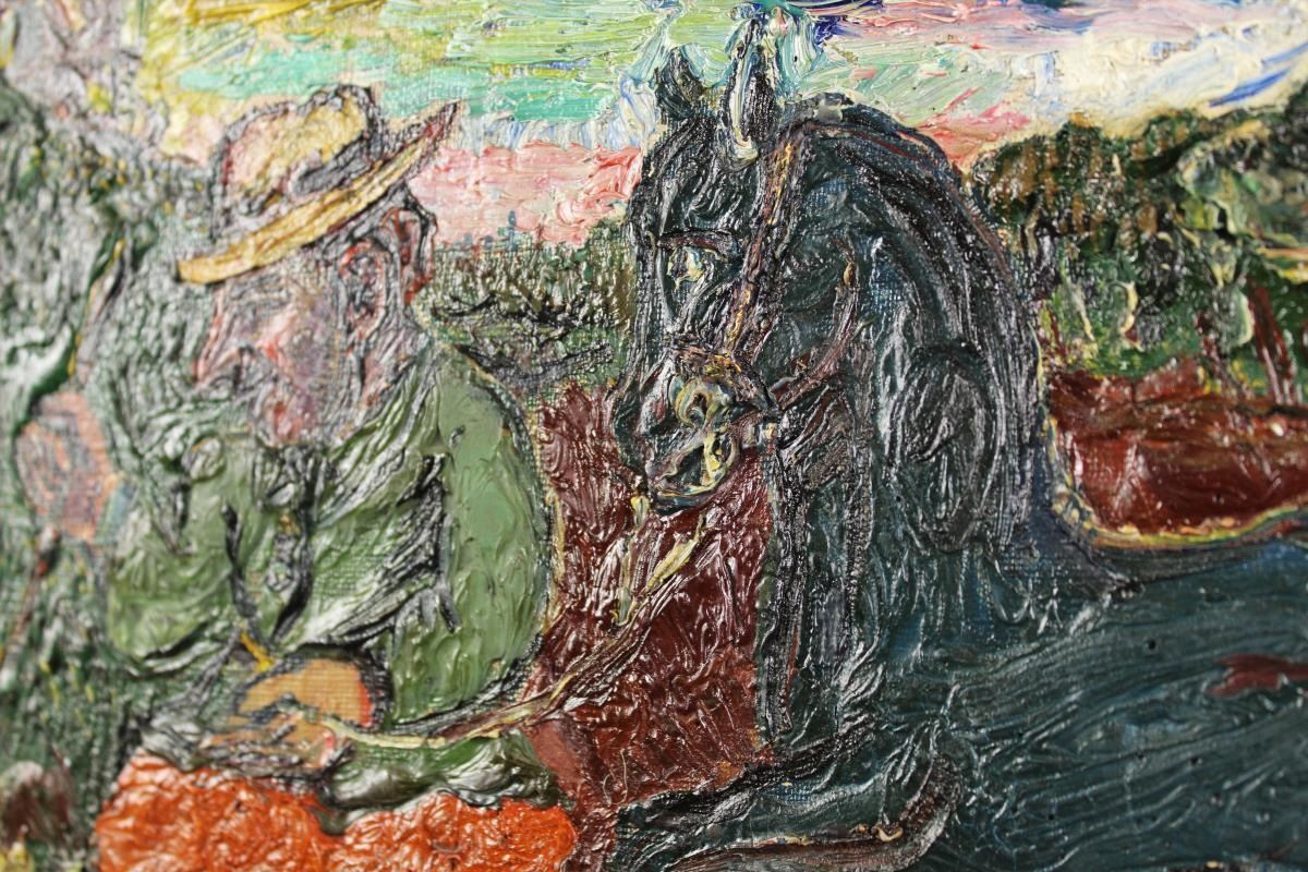 Attractive oil on board by David Burliuk, signed Burliuk in the lower left. It is titled "The Blue Horse" a thick impasto on board. Provenance: acquired in '85 at A.C.A. gallery 57th St NYC.