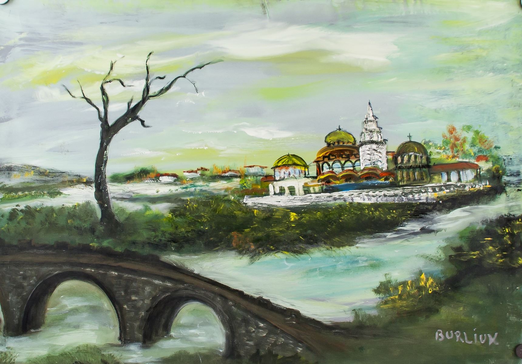 Oil on canvas, unstretched. Featuring a landscape scene. Signed BURLIUK on the lower right corner. On verso inscribed a landscape sketch of an orthodox church building. Attributed to David Burliuk (1882-1967 American-Ukrainian). 53 x 74 cm (20.8 x 29.1 inches). PROVENANCE: Upper New York estate