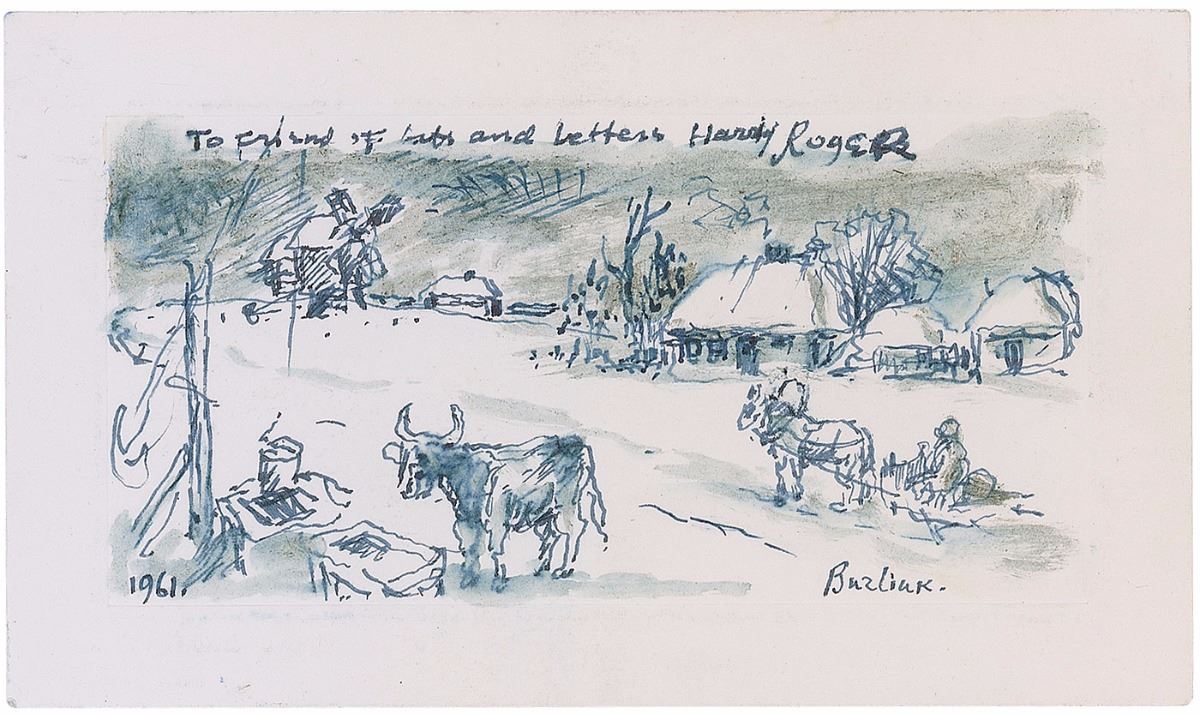Ukrainian Futurist, Neo-Primitivist, and book illustrator (1882–1967) considered ‘the father of Russian Futurism.’ Original ink sketch of a detailed countryside scene accomplished by Burliuk on an off-white 5.75 x 3.5 card, signed in the lower right, “Buliuk,” and inscribed along the top, “To friend of arts and letters Harry Roger.” In fine condition.