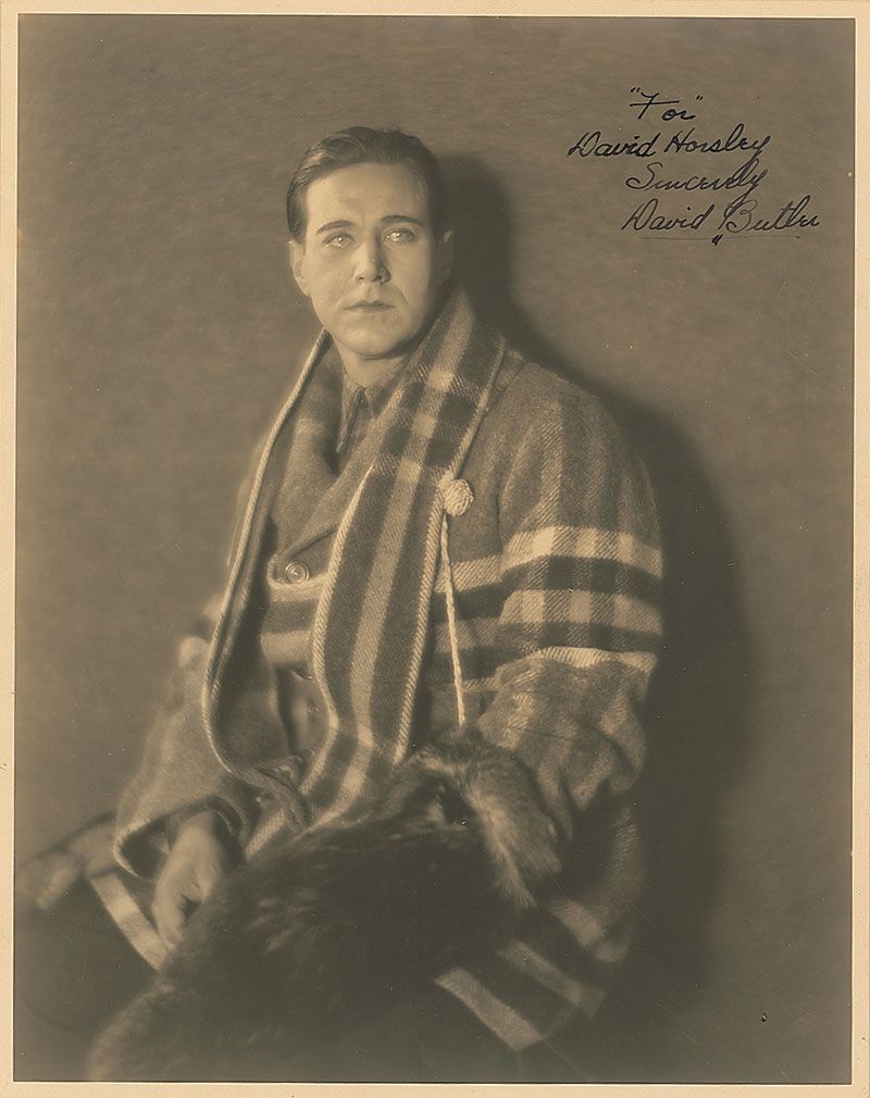 Director (1894–1979) best known for films such as Calamity Jane and Road to Morocco. Vintage matte-finish 7.5 x 9.5 three-quarter-length portrait of Butler, signed and inscribed in fountain pen, “‘For’ David Horsley, Sincerely, David Butler.” In fine condition. Horsley was a film industry pioneer who built the first Hollywood studio.