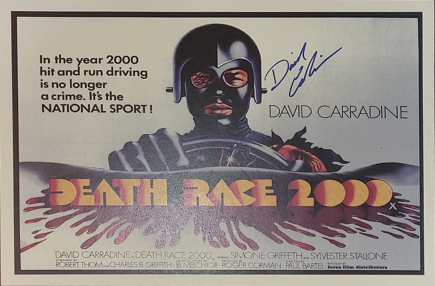 Window card sized poster for the film Death Race 2000 signed by David Carradine. All items come with a COA and guarantee for the life of the piece.