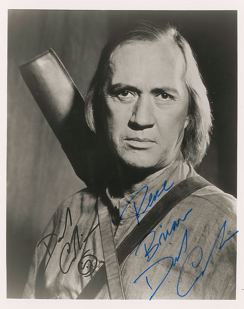 Glossy 8 x 10 photo of Carradine, signed and inscribed in blue felt tip, “Peace Brian, David Carradine.” The photo also bears a pre-printed signature in the lower left. In very fine condition.