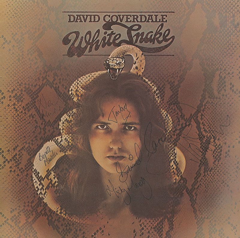 White Snake album signed on the front cover in black ink by David Coverdale, Micky Moody, Bernie Marsden, Ian Paice, Jon Lord, and Neil Murray. In fine condition, with some mild rippling to front cover and just a bit of light contrast to a couple of the signatures. The record is not included. Accompanied by a full letter of authenticity from Roger Epperson/REAL.