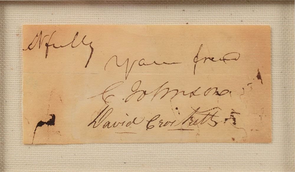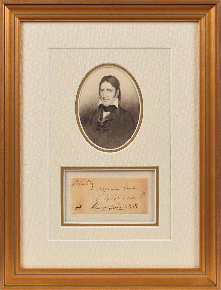 Famed frontiersman, politician, and folk hero (1786–1836) who became famous for his shrewd and humorous speeches; he was killed at the Alamo during the Texas Revolution. Rare ink signature, “David Crockett,” on an off-white 4 x 1.75 slip, clipped from the closing of a letter in an unidentified hand. Handsomely archivally mounted, cloth-matted, and framed with an engraved portrait of Crockett to an overall size of 11 x 14.5. In very good condition, with mild irregular toning. A most desirable and difficult-to-acquire important American signature.