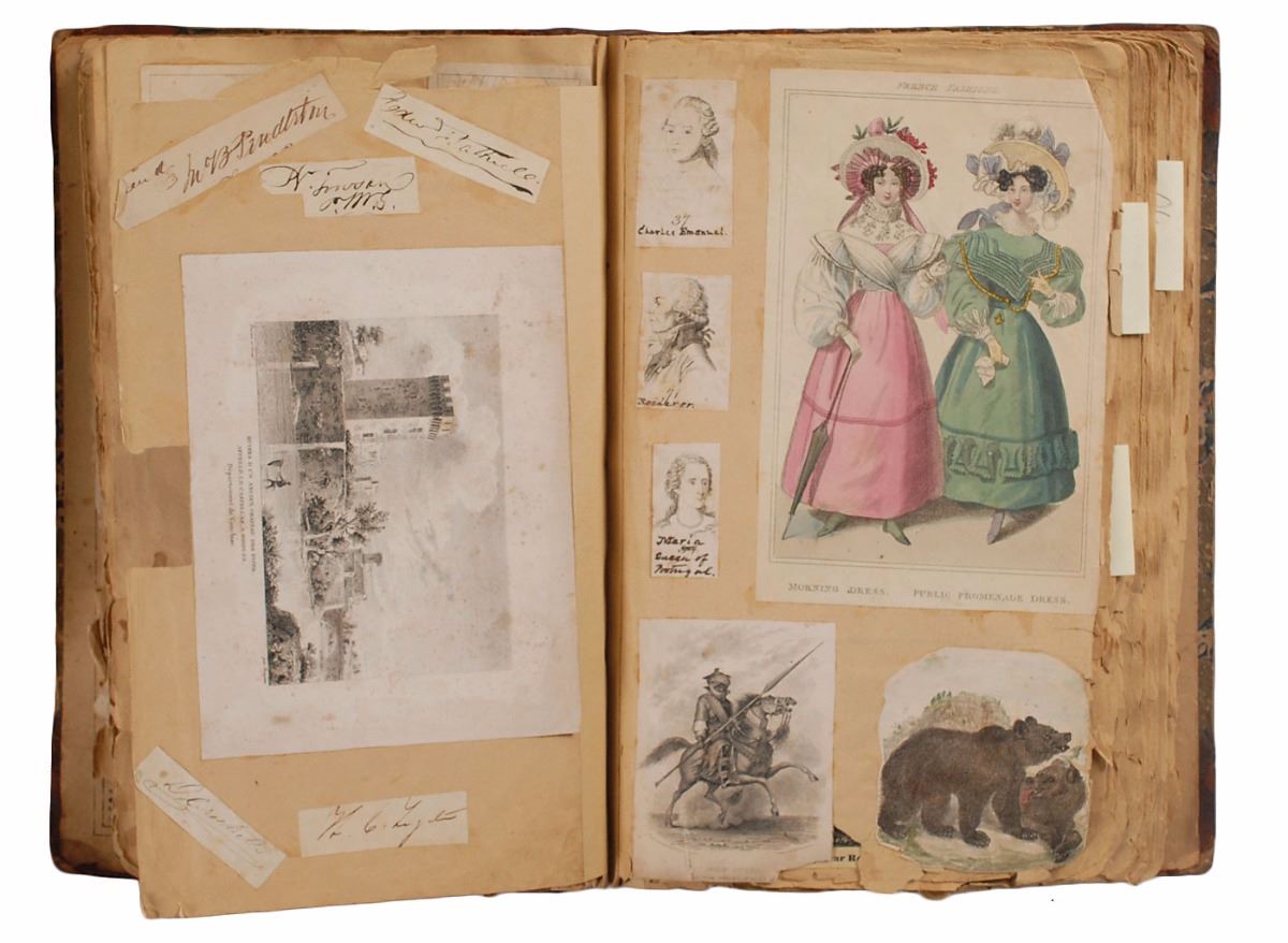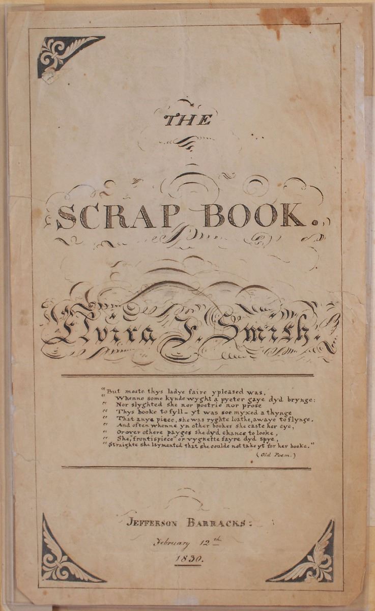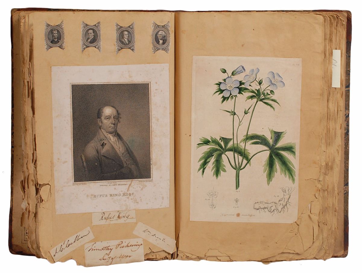 Smith is identified as the owner on a detached page with ornate calligraphy, “The Scrap Book, Elvira F. Smith…Jefferson Barracks: February 12, 1830.” Smith was the wife of infantry officer Henry Smith, who was stationed at Jefferson Barracks, Missouri, from 1830 to 1832. Henry Smith graduated from West Point in 1815 and served throughout the country, including positions as quartermaster in New York, Green Bay, Michigan, and Arkansas, as well as aide-de-camp to General Winfield Scott. Though not known for certain, the majority of the signatures collected by Elvira Smith were probably clipped from letters to Mr. Smith. With a diverse array of scarce autographs and numerous hard-to-find engravings, this is a truly remarkable and undoubtedly unique historical scrapbook.