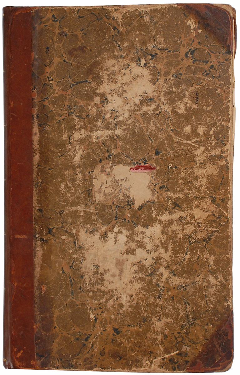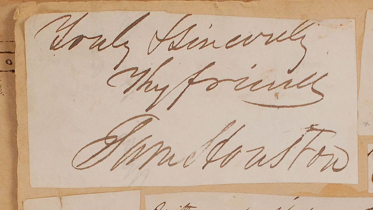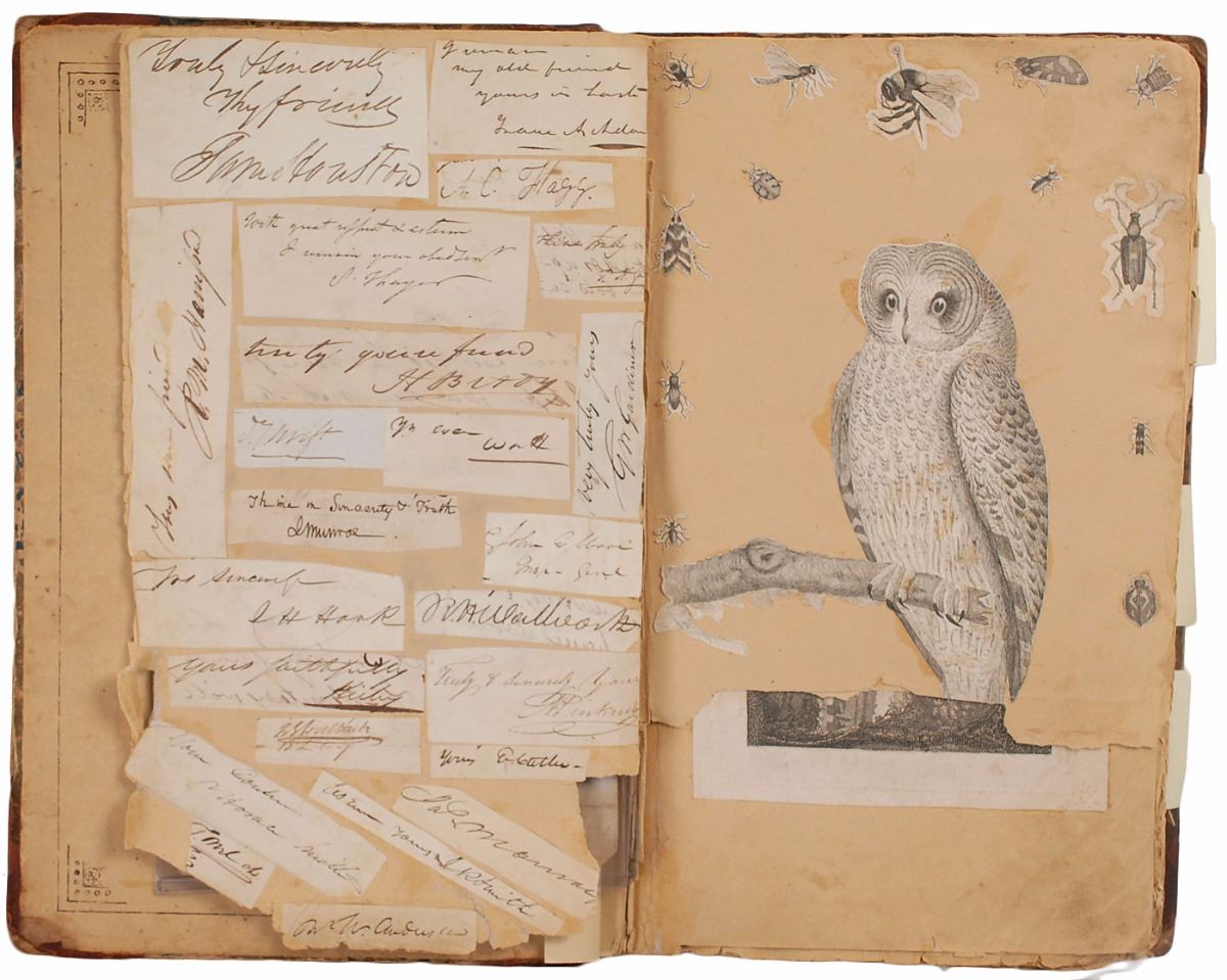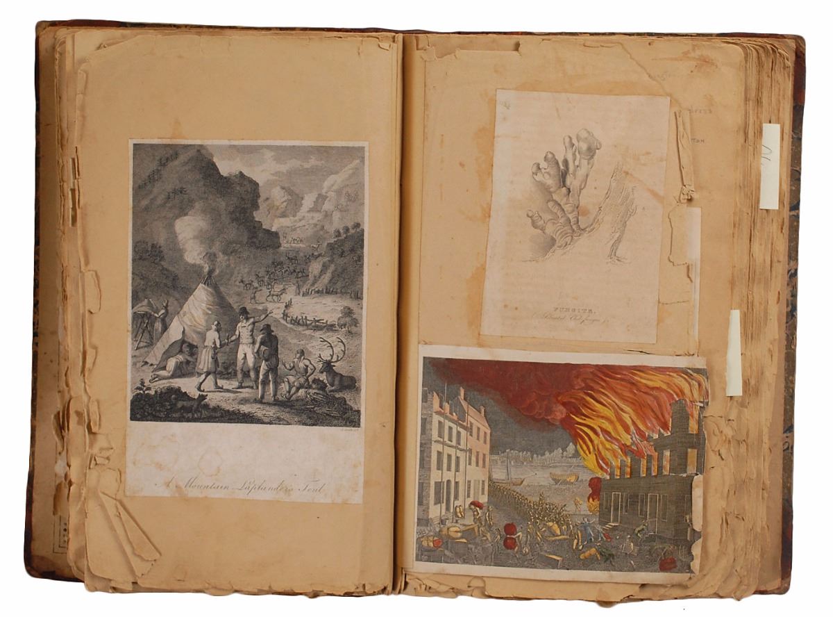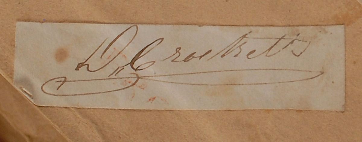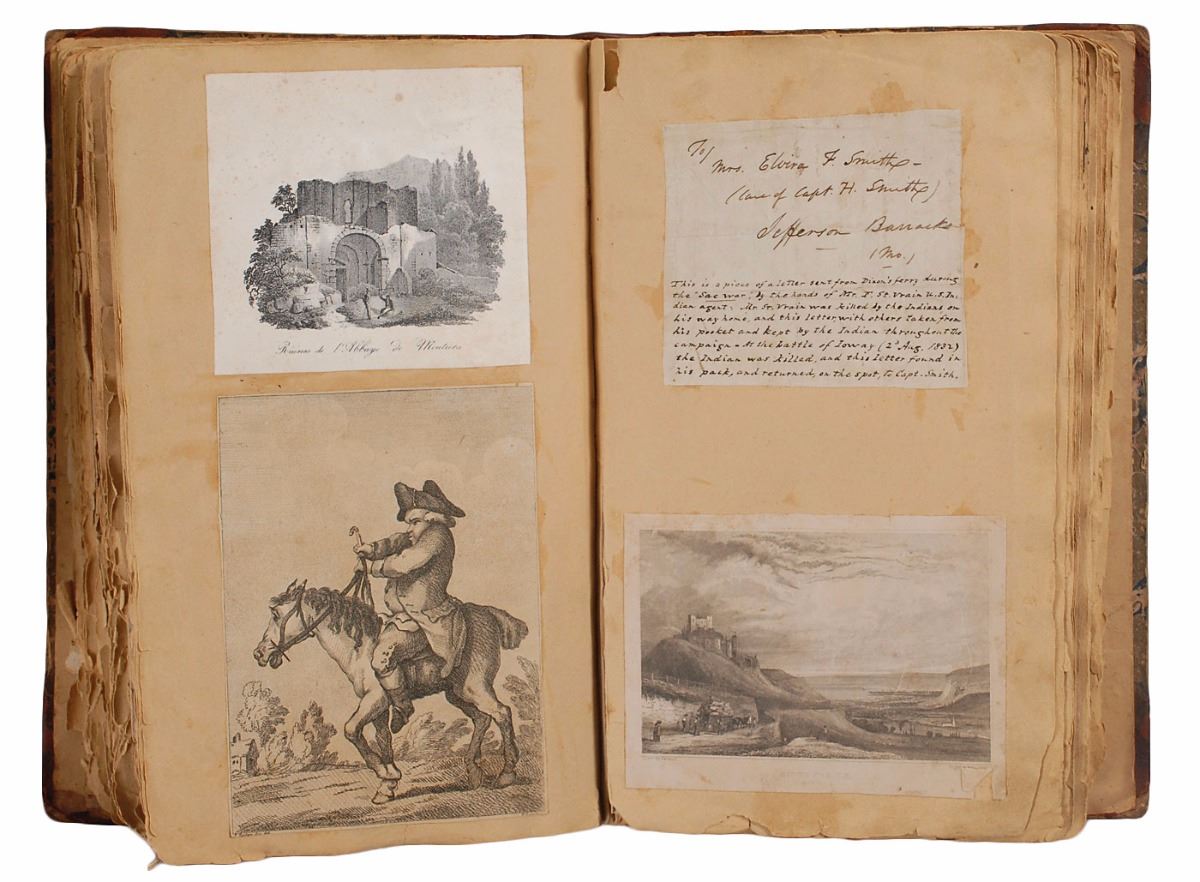 Incredible scrapbook compiled circa 1830s by Elvira Loraine Foster Smith, approximately 80 pages, 8.5 x 13.5, containing 49 clipped signatures affixed throughout, a large fabric swatch attributed to Martha Washington’s dress per a contemporary notation, a relic from the St. Vrain Massacre of the Black Hawk War, and dozens of period engravings and ephemera as typically found in such collections. The signatures affixed within represent a wide swath of significant early American figures, including: David Crockett, “D. Crockett”; Sam Houston, “Truly & sincerely thy friend, Sam Houston”; Daniel Webster, “Danl Webster, US Senate”; John C. Calhoun, “J. C. Calhoun”; Timothy Pickering, “Timothy Pickering, Secy of War”; Winfield Scott, “Yr friend Winfield Scott”; and others such as Rufus King, William Eaton, Lewis Cass, William Dayton, William G. Belknap, and John Howard Payne. The swatch of fabric attributed to Martha Washington measures 2.5 x 2 and is a deep maroon with dark stripes and a floral pattern, identified above with a period pencil notation, “Part of a dress of the late Mrs. Gen. Washington.” The relic of the St. Vrain Massacre is the address panel of a letter to Elvira Smith being carried by US Indian agent Felix St. Vrain when he was killed during a mission to deliver dispatches from Dixon's Ferry to Galena. The panel bears a lengthy period notation, reading: “This is a piece of a letter sent from Dixon’s ferry during the ‘Sac War,’ by the hands of Mr. F. St. Vrain…Mr. St. Vrain was killed by the Indians, on his way home, and this letter, with others taken from his pocket and kept by the Indian throughout the campaign. At the battle of Ioway (2d Aug. 1832) the Indian was killed, and this letter found in his pack, and returned, on the spot, to Capt. Smith.” The engravings affixed throughout, some of which are hand-colored, depict a wide variety of subjects including plants, animals, places, and historical figures. In very good condition, with brittle pages, chips, tears, and paper loss to edges, and scattered toning and soiling. Housed in a gorgeous custom-made slipcase which includes an inlaid copy of the scrapbook’s title page on the front (original is included but detached from binding).
