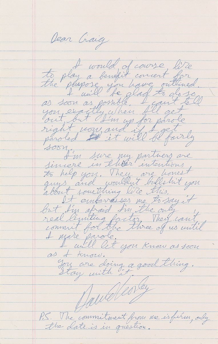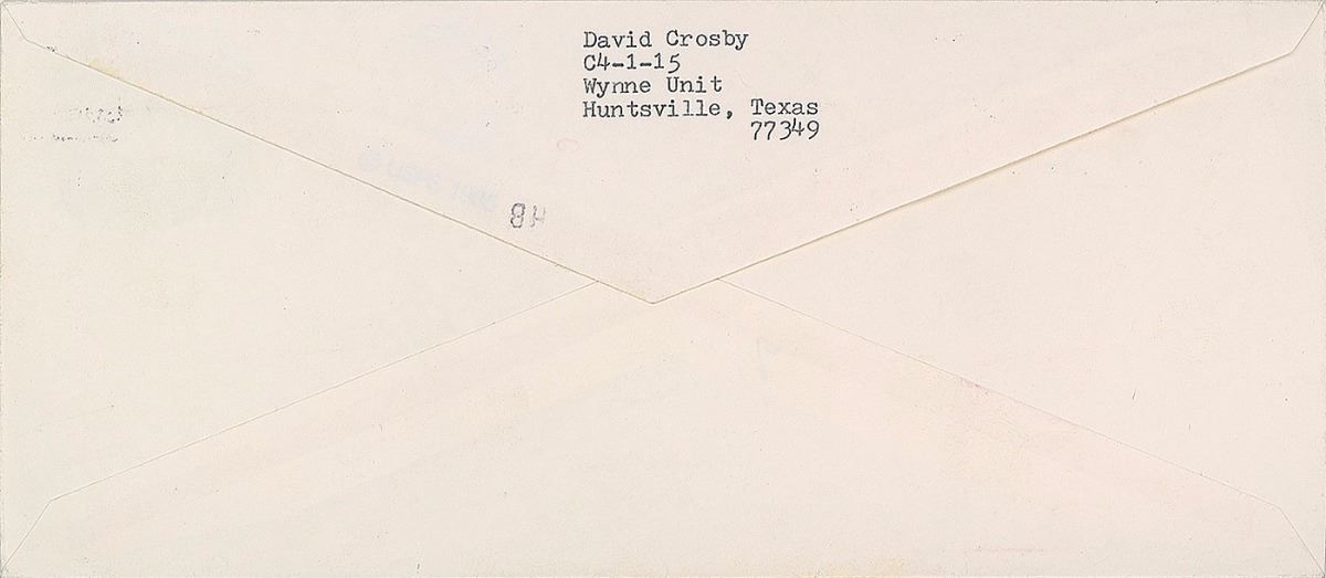 Rare ALS, one page, lightly-lined, 8.5 x 13.25, no date but postmarked July 18, 1986. Written from the John M. Wynne Unit prison in Huntsville, Texas, a letter to Craig Krueger, in full: “I would of course like to play a benefit concert for the purpose you have outlined. I will be glad to do so as soon as possible. I can’t tell you exactly when I’ll get out, but I’m up for parole right now, and if I get paroled it will be fairly so on. I’m sure my partners are sincere in their intentions to help you. They are honest guys and wouldn’t bullshit you about something like this. It embarrasses me to say it but I’m afraid I’m the only real limiting factor. They can’t commit for the three of us until I make parole. I will let you know as soon as I know. You are doing a good thing. Stay with it.” Crosby adds a brief postscript, “The commitment from me is firm, only the date is in question.” In fine condition. Accompanied a copy of a letter of provenance from the original recipient, in part: “In 1985, I began to organize the Youth For Vietnams Veteran Concert which took place November 11, 1986. Because David Crosby, Stephen Stills, and John Fogerty all promoted peace, I contacted their management and each of them individually. I wrote to David Crosby while he was in Huntsvile, Texas. I was very pleased when he wrote back to me that he would be happy to perform after he was granted parole. David performed with Stephen Stills, John Fogerty, George Thorogood and Michael Finnigan. Also at the concert along with performers were Peter Fonda and Jon Voight.” Crosby was sentenced to five years in a state penitentiary following his April 1982 arrest at Dallas’ Cardi’s nightclub for felony cocaine and weapon possession; despite the songwriter’s noted anti-violence stance, he began carrying a handgun shortly after the murder of John Lennon. Crosby began serving his sentence on March 6, 1986, and was released on parole after five months, a stint he affirms helped kick his drug addiction. Representing the first instance in which a Crosby prison letter has been offered in auction, this wonderful correspondence piece serves as a uniquely historic bridge between the civil unrest of the 1960s and the role rock musicians played in easing public tension.