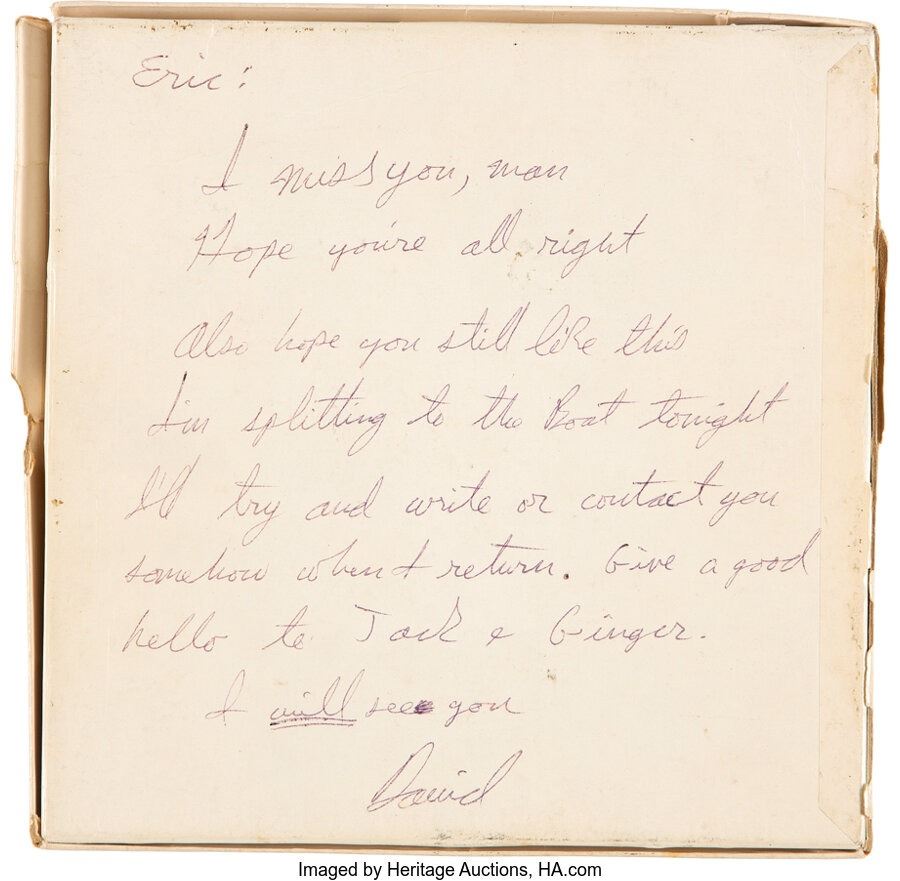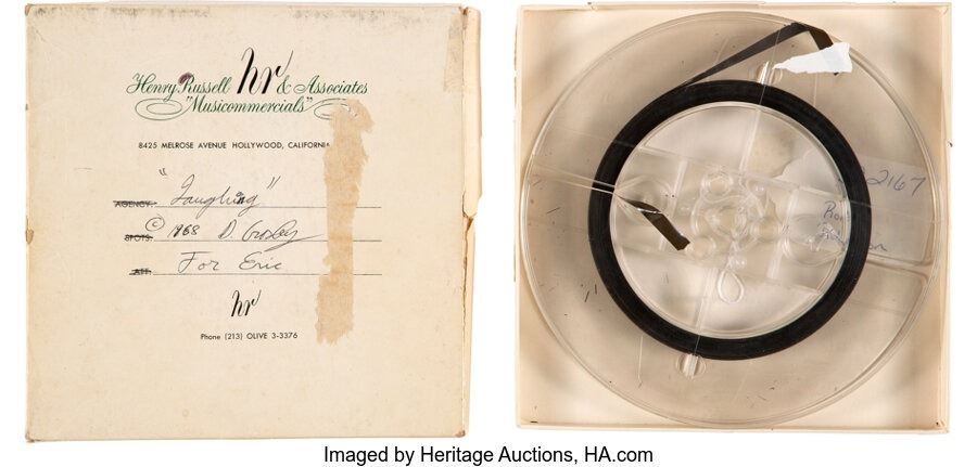 David Crosby Signed and Inscribed "Laughing" Reel Box With Reel (1968). A ½" x 7 ¼" x 7 ¼" box from Henry Russell Associates "Musicommercials" on 8425 Melrose Ave in Hollywood featuring a handwritten note to Eric Clapton from David Crosby in ballpoint pen ink. The ink color has faded, but appears to be originally black. Note reads on the back: