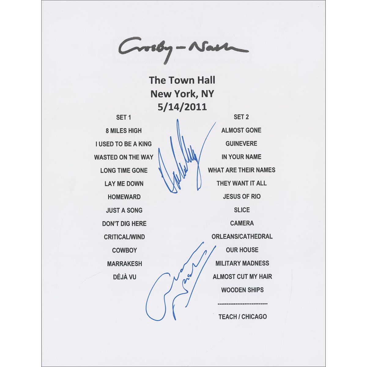 Souvenir set list from their May 14, 2011, concert at The Town Hall in New York, one page, 8.5 x 11. Set list consists of 26 songs and is signed in blue felt tip by David Crosby and Graham Nash. In fine condition.