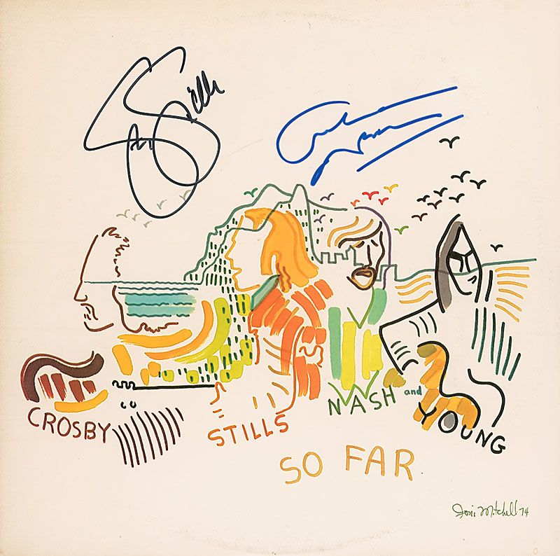 So Far album signed on the front cover in black felt tip by Stephen Stills and in blue felt tip by Graham Nash. In fine condition. The record is included.