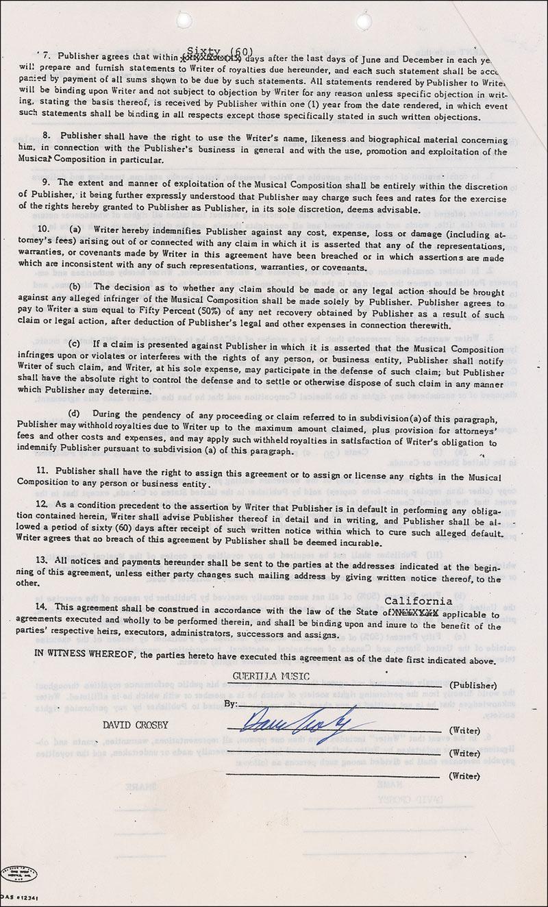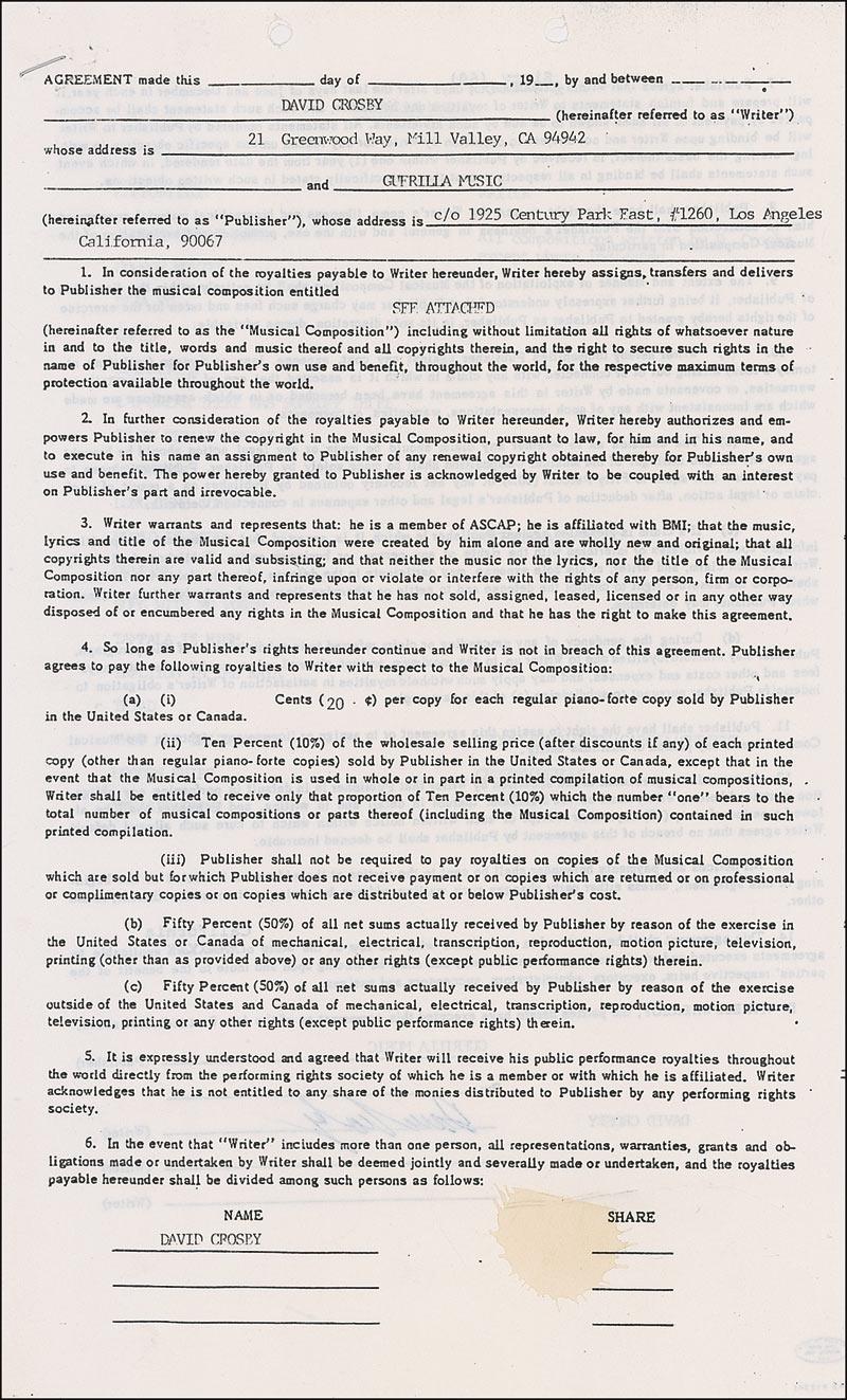 DS, one page both sides, 8.5 x 14, no date. Music royalty agreement between Crosby and Guerilla Music. Attached 8.5 x 11 page lists eighteen compositions, including “Long Time Gone” and “Wooden Ships”. Signed on the reverse of the first page by Crosby. Punch holes and staple to top edge, light handling wear, and toning to bottom of front of document, otherwise fine condition. RRAuction COA.