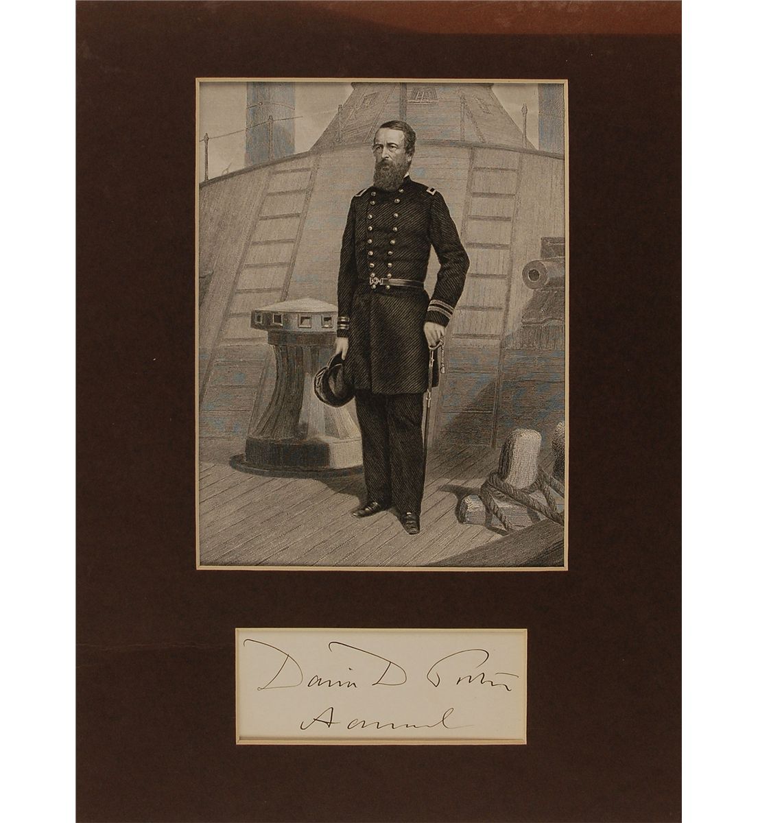 Admiral (1813–1891) who helped improve the Navy as the Superintendent of the US Naval Academy after significant service in the American Civil War. Ink signature, “David G. Porter, Admiral,” on an off-white card. Matted with an engraved portrait to an over