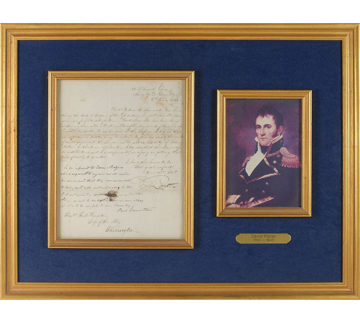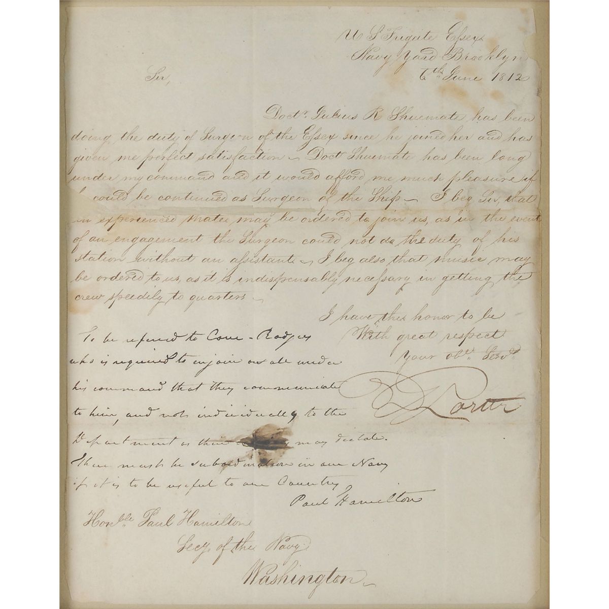 American naval officer (1780–1843) who led the first capture of a British vessel during the War of 1812 and who later served as commander-in-chief of the Mexican Navy. LS signed “D. Porter,” one page, 8 x 10, June 6, 1812. Letter to Secretary of the Navy Paul Hamilton. In part: “Doct. Julius R. Shuemate has been doing the duty of Surgeon of the Essex since he joined her…it would afford me much pleasure if [he] could be continued as Surgeon of the Ship. I beg that an experienced mate may be ordered to join us, as in the event of an engagement the Surgeon could not do the duty of his station without an assistant…I beg also that music may be ordered to us, as it is indispensably necessary in getting the crew speedily to quarters.” Hamilton has written his response in the lower left corner, which reads, in full: “To be referred to Comm. Rodgers who is required to enjoin all under his command that they communicate to him, and not individually to this Department...There must be subordination in our Navy for it to be useful to our Country.” Framed to an overall size of 9 x 11, which is in turn framed with a color portrait and small plaque to an overall size of 22.5 x 17.5. Small area of paper loss to left edge affecting a single word of text, ink blot over a word in Hamilton’s response, intersecting folds, one through a single letter of signature, and some light paper loss along a horizontal fold, otherwise very good condition.