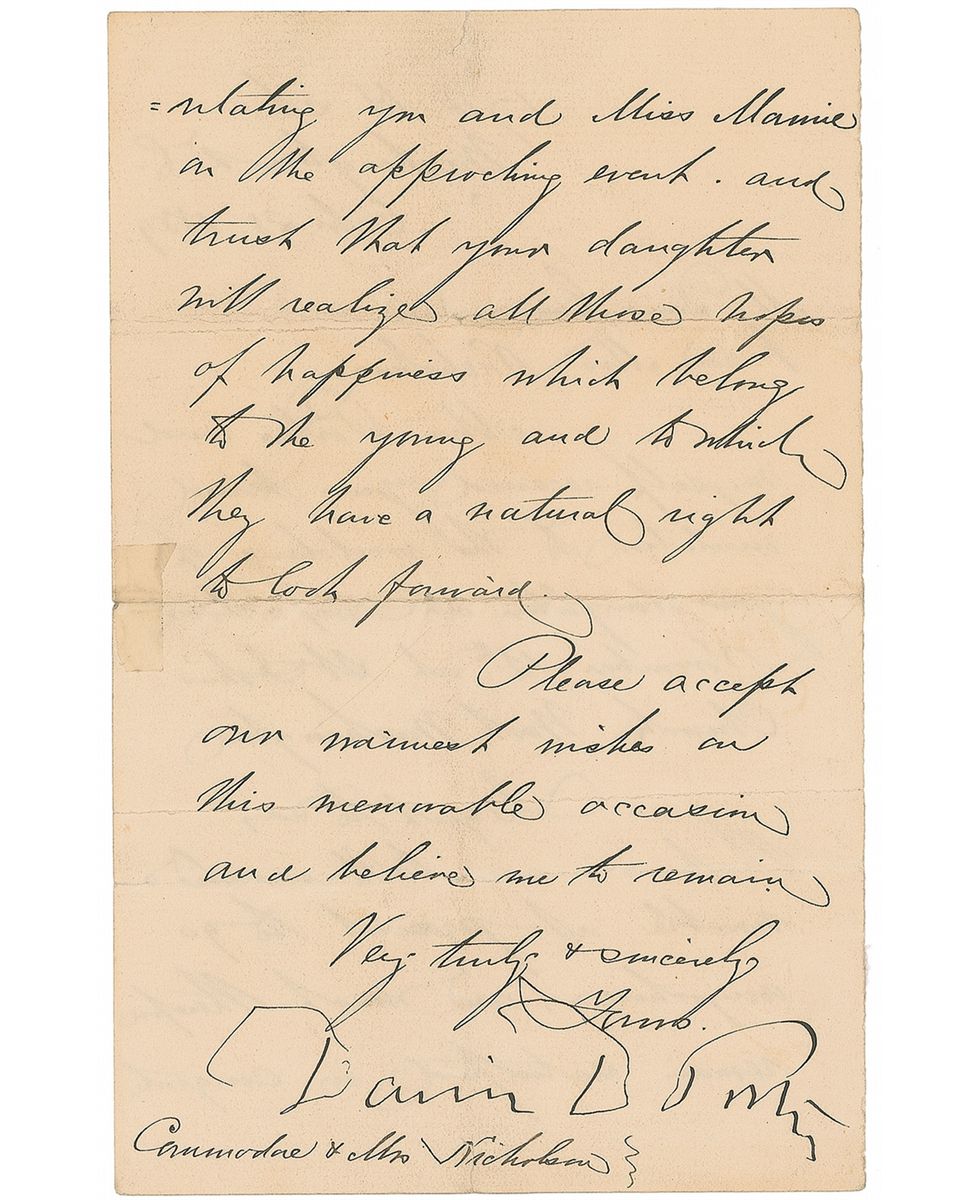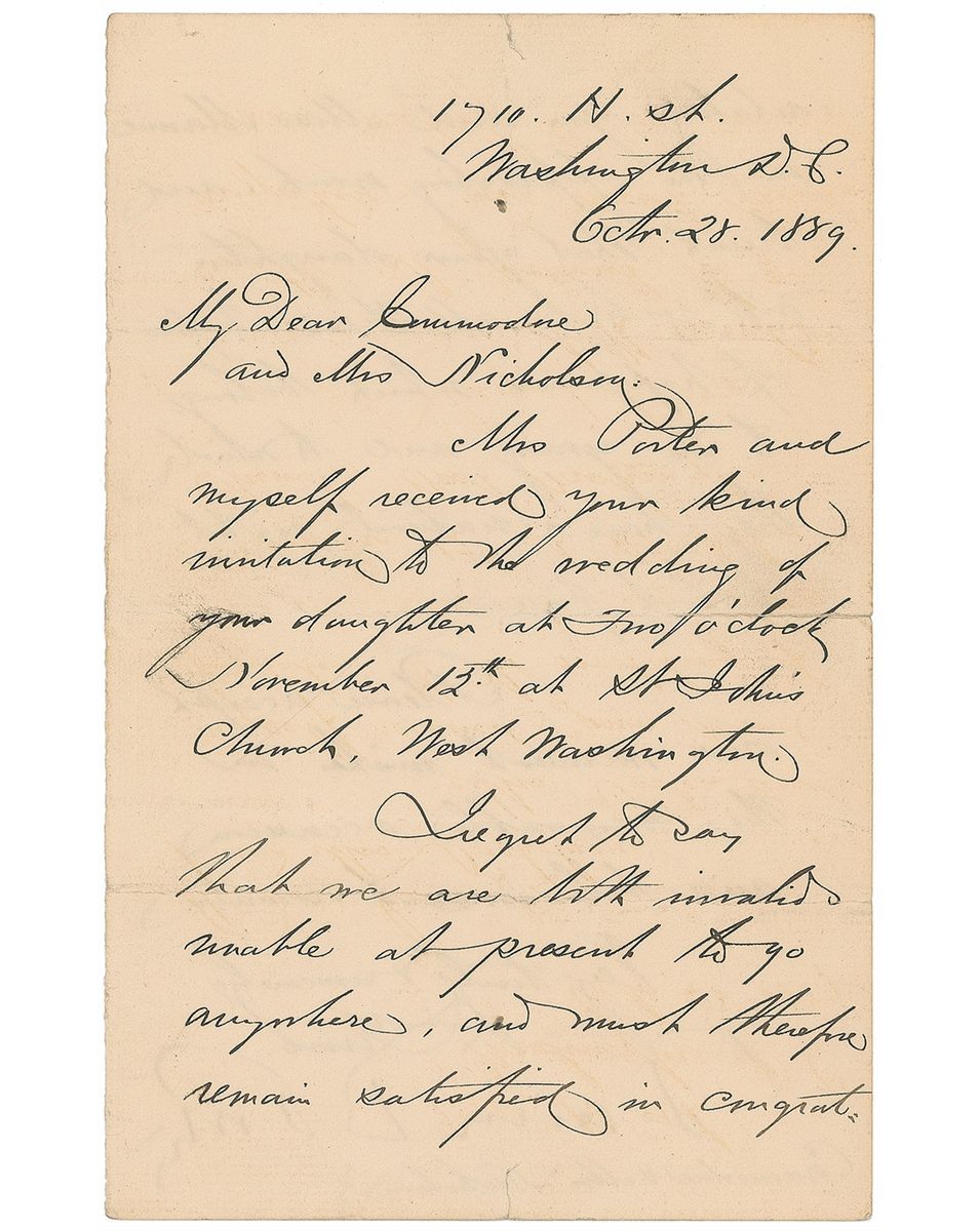 Admiral (1813–1891) who helped improve the Navy as the superintendent of the US Naval Academy after significant service in the American Civil War. LS, one page both sides, 4.5 x 7, October 28, 1889. Letter to Commodore Nicholson. In part: “Mrs. Porter and myself received your kind invitation to the wedding of your daughter…I regret to say that we are both invalid & unable at present to go anywhere.” Several horizontal folds with one small tape-repaired edge separation, otherwise fine condition.
