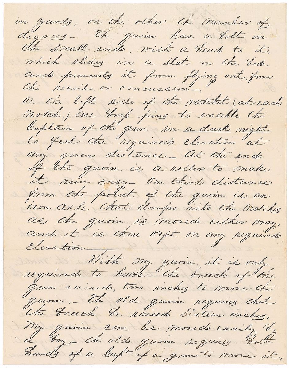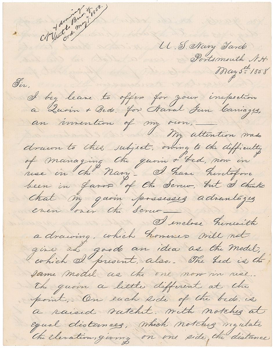 Admiral (1813–1891) who helped improve the Navy as the superintendent of the US Naval Academy after significant service in the American Civil War. LS, three pages on two adjoining sheets, 7.75 x 10, May 5, 1858. Letter to Captain John Pope, explaining his recent invention improving upon the quoin—a notched wedge for supporting and maneuvering cannons—used on naval gun carriages. In part: “I beg leave to offer for your inspection a Quoin & Bed for Naval Gun Carriages, an invention of my own,—My attention was drawn to this subject, owing to the difficulty of managing the quoin & bed, now in use in the Navy—I have heretofore been in favor of the Screw, but I think that my quoin possesses advantages even over the Screw…The quoin has a bolt in the small end, with a head to it, which slides in a slot in the bed, and prevents it from flying out, from the recoil, or concussion…With my quoin, it is only required to have the breech of the gun raised, two inches to move the quoin.—The old requires that the breech be raised sixteen inches. My quoin can be moved easily by a boy,—the old quoin requires both hands of a Capt of a gun to move it, and then, not only with great difficulty, but with the risk of not getting into the right ratchet, and having to try it over again.” In fine condition. Accompanied by a photocopy of Porter’s patent for the invention, which was granted on December 21, 1858.