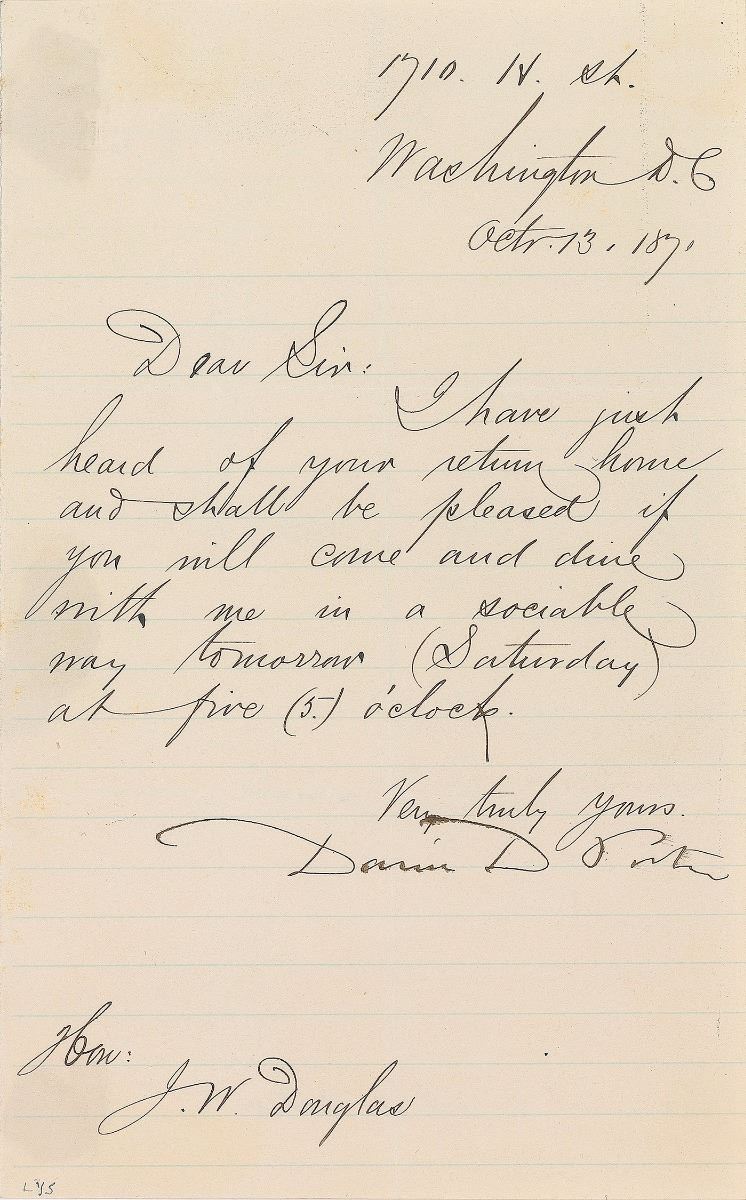 LS, one page, 5 x 8, October 13, 1871. Letter to Hon. J. W. Douglas. In part: “I have just heard of your return home and shall be pleased if you will come and dine with me in a sociable way tomorrow.” In fine condition. Accompanied by an unsigned engraved portrait.