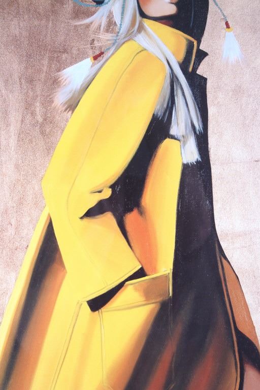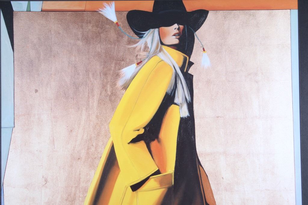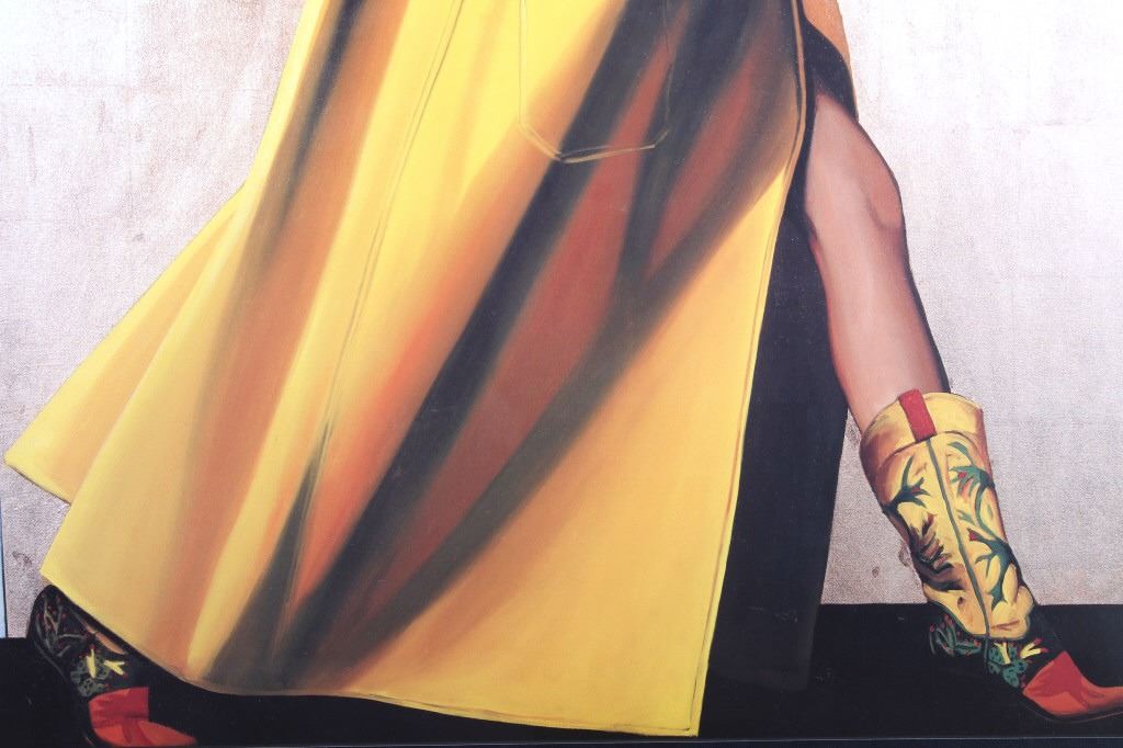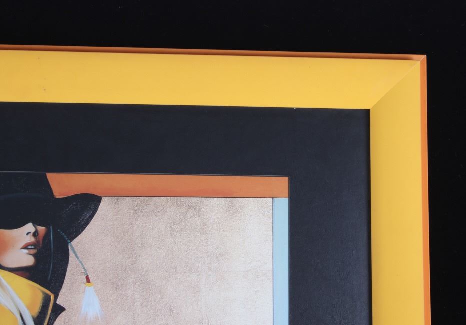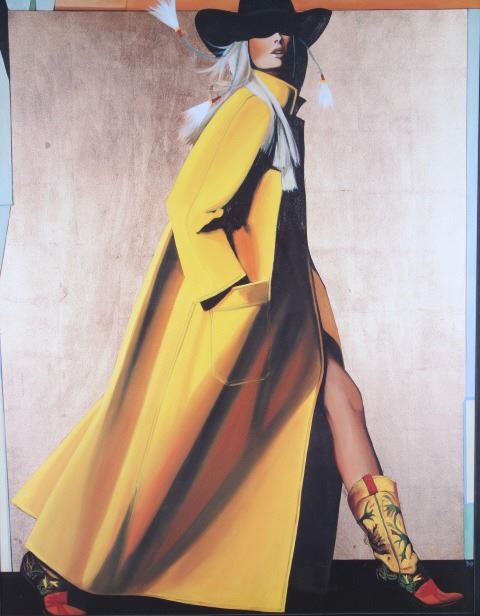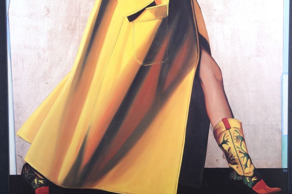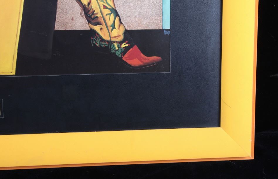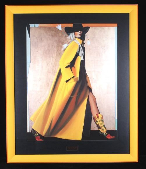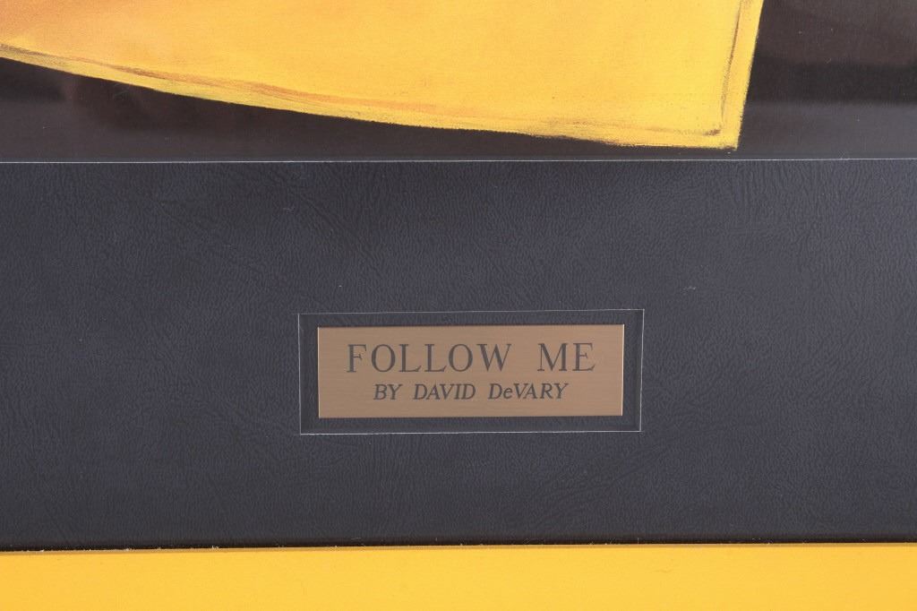 Featured in this lot is this David Devary (1943-2020) "Follow Me", framed Giclée with Plaster of Paris frame. The Giclée print features a woman in a yellow slicker and cowboy boots, walking with her head turned to the right and wearing a cowboy hat. The bottom reads, “Follow Me - David Devary”. David Devary is an American painter living in Sante Fe; he became known as a "New West" artist. He used symbols of the American West to express universal emotions, themes, and attitudes. DeVary's work is featured in the 2018 book "Western Art of the Twenty-First Century" and is found in major public and private collections. This piece features a special museum conservation glass and a custom Plaster of Paris frame and was painted and made in Paris, France. The condition of this artwork is good, with no obvious signs of damage to the artwork or the frame. The measurements of this framed artwork are 37 1/2" x 31 3/4" and the visible art measures 27 1/2" x 21 1/2".