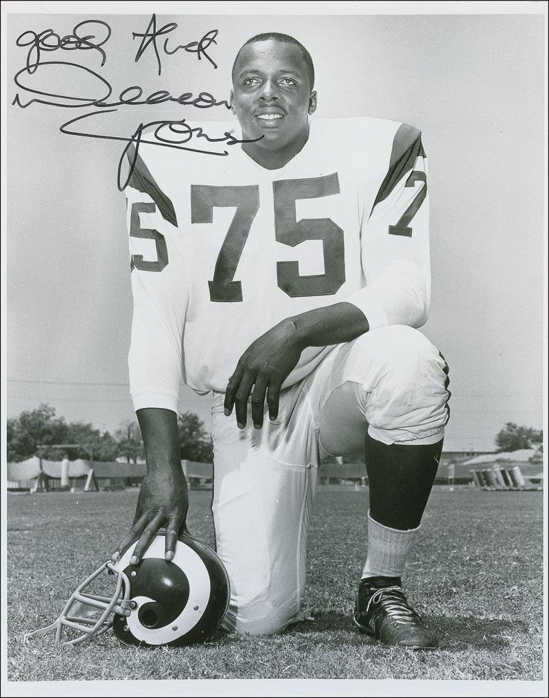 Vintage glossy 8 x 10 Los Angeles Rams publicity photo, signed in black felt tip “Good luck, Deacon Jones.” Date-stamped on the reverse March 5, 1969 with a Rams and a photographer’s credit stamping. In fine condition, with a few faint scratches to the emulsion and surface marks.